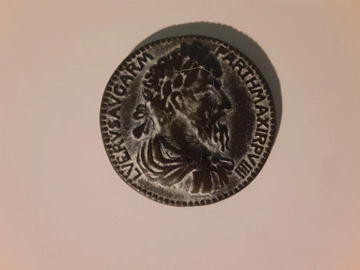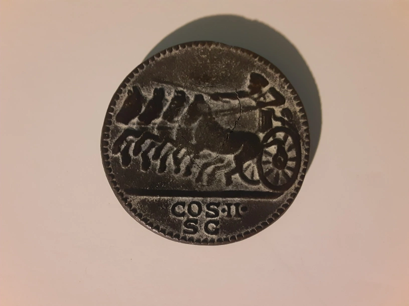 Two-sided replica of an ancient Roman coin. Features a profile portrait on one side and a chariot scene on the other. Shows some wear/cracks. Interesting historical piece.