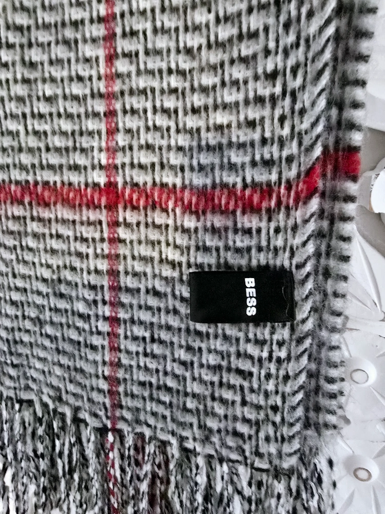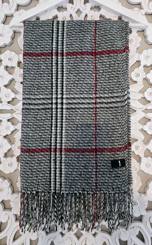 69Warm and cozy scarf. Features a grey and red plaid pattern. Soft material. Fringed edges. Perfect for fall and winter.