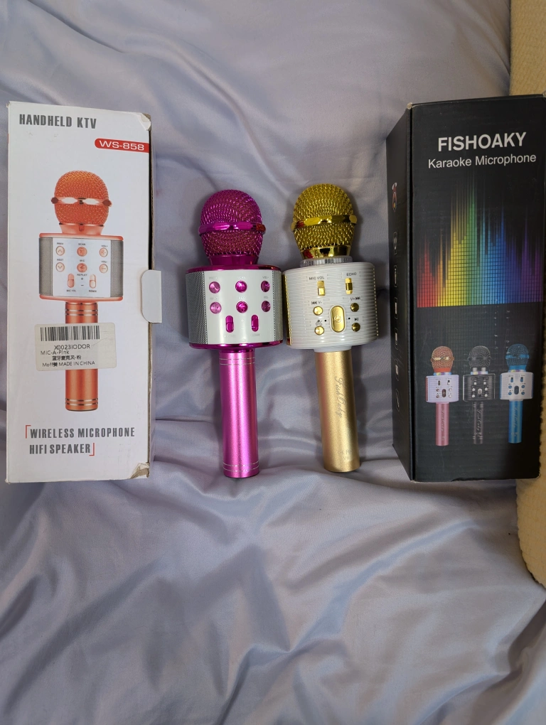 Two handheld karaoke microphones. Pink and gold. Wireless with built-in speakers. Great for parties and singing.