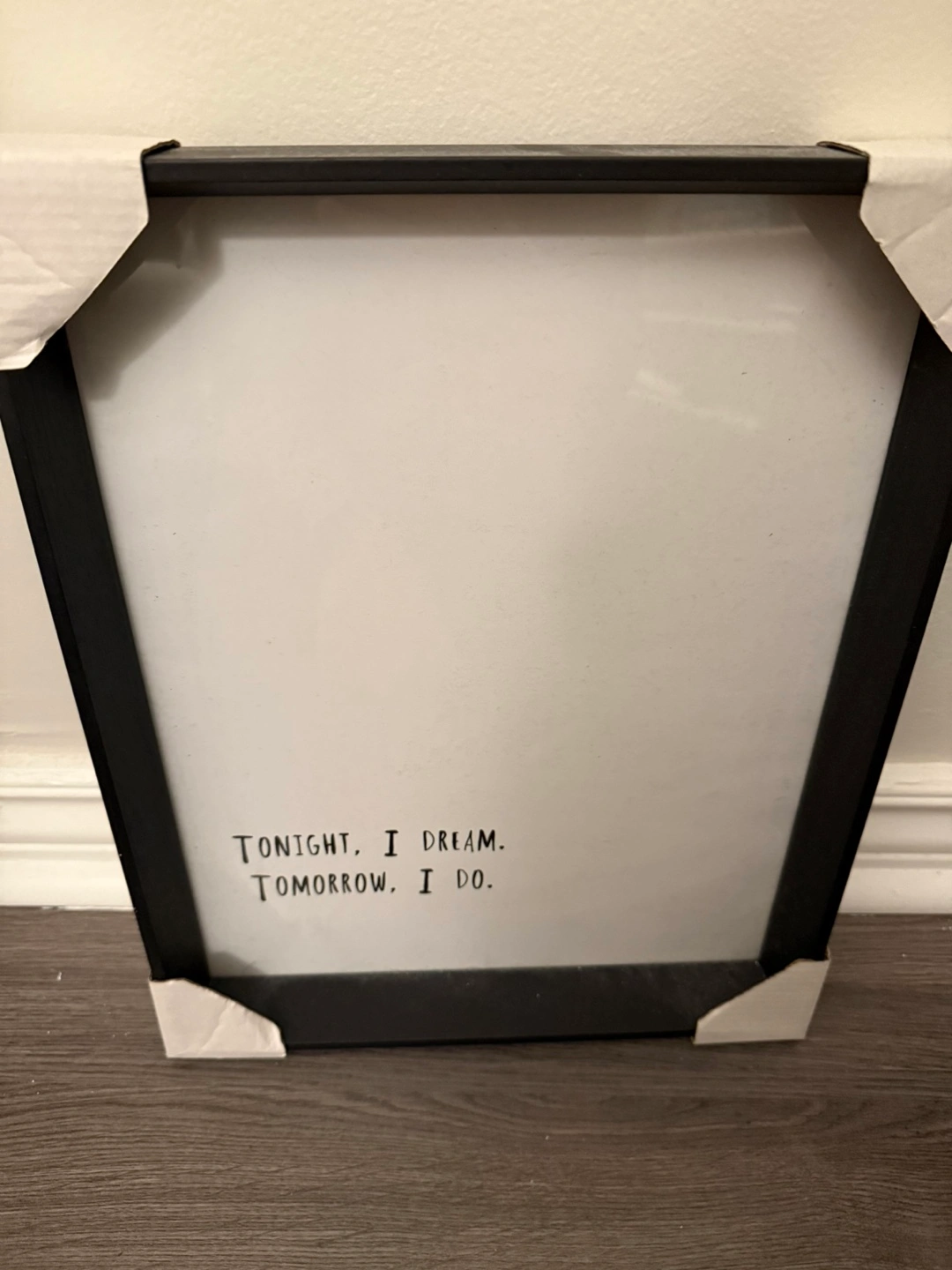 Black framed wall art. Features the quote: Tonight, I dream. Tomorrow, I do. Simple design, great for bedroom or office.
