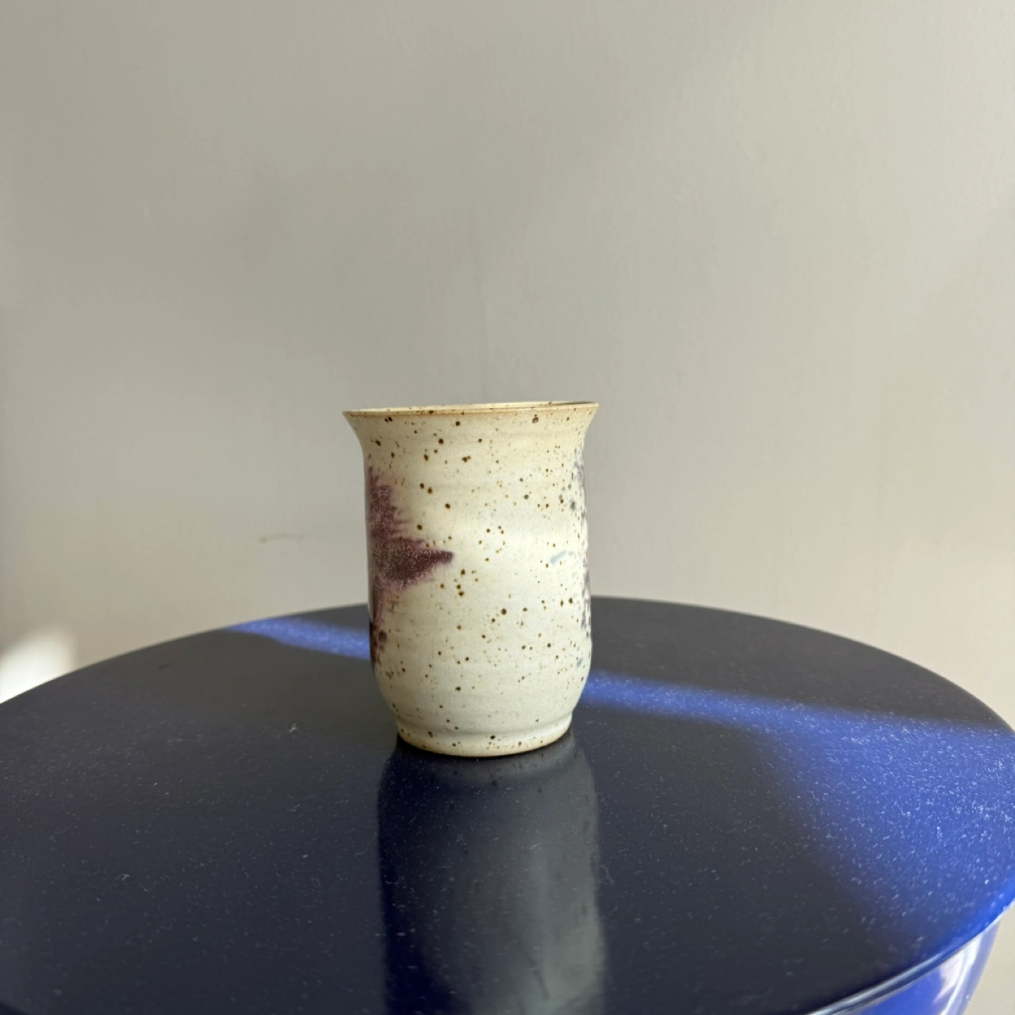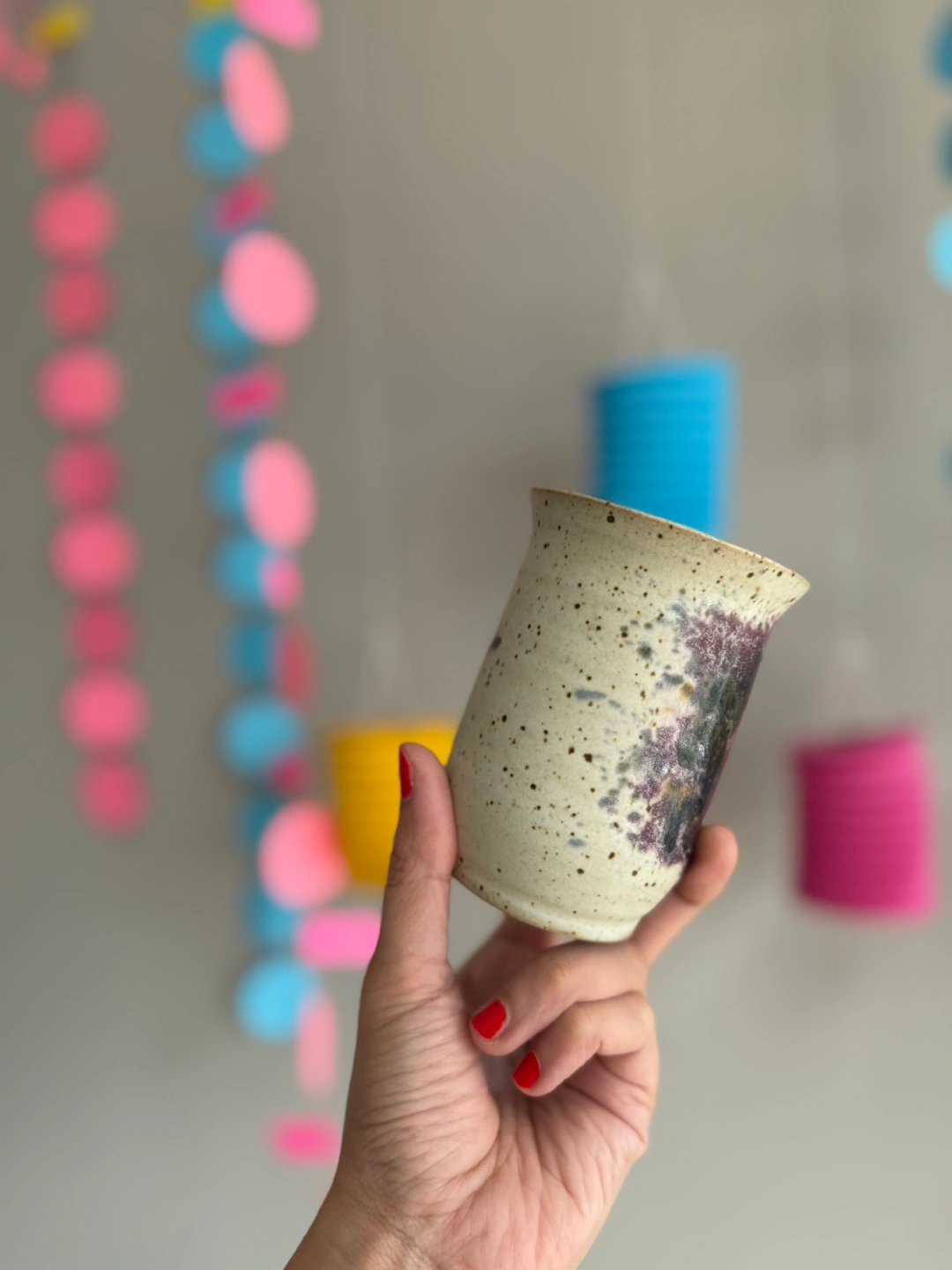Features a speckled beige exterior and purple, brown, and blue marbling.