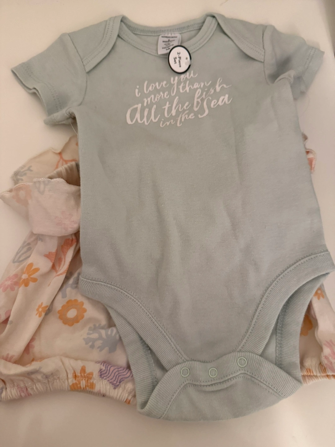 Adorable baby girl's outfit, size 6 months. Includes a light blue bodysuit with a cute ocean-themed quote and coordinating bloomers. Features a pastel colour palette. Soft cotton material.