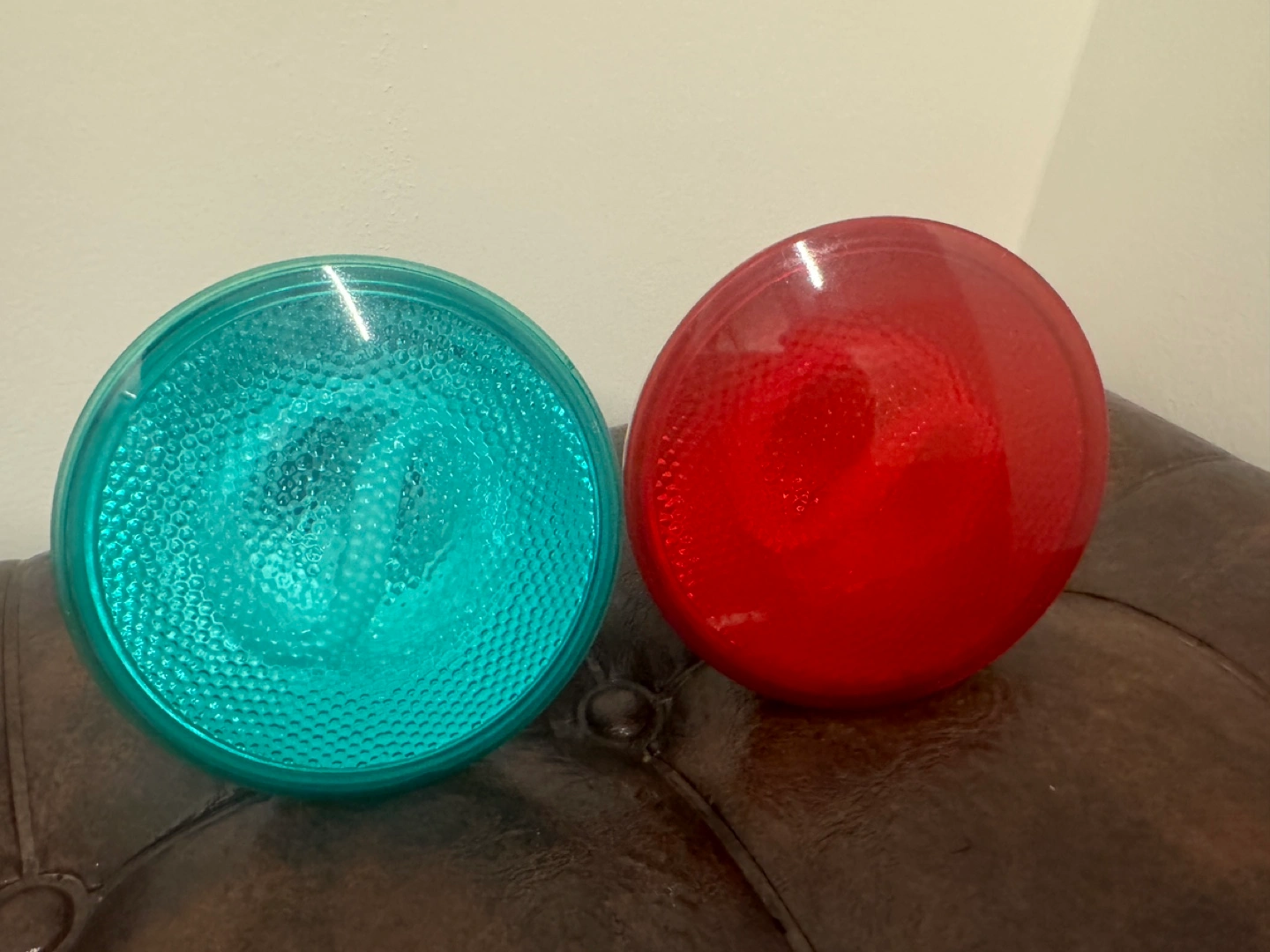 Two vintage Philips PAR38 reflector bulbs. One red, one green. 12V, 50W. Excellent condition. Unique colours.