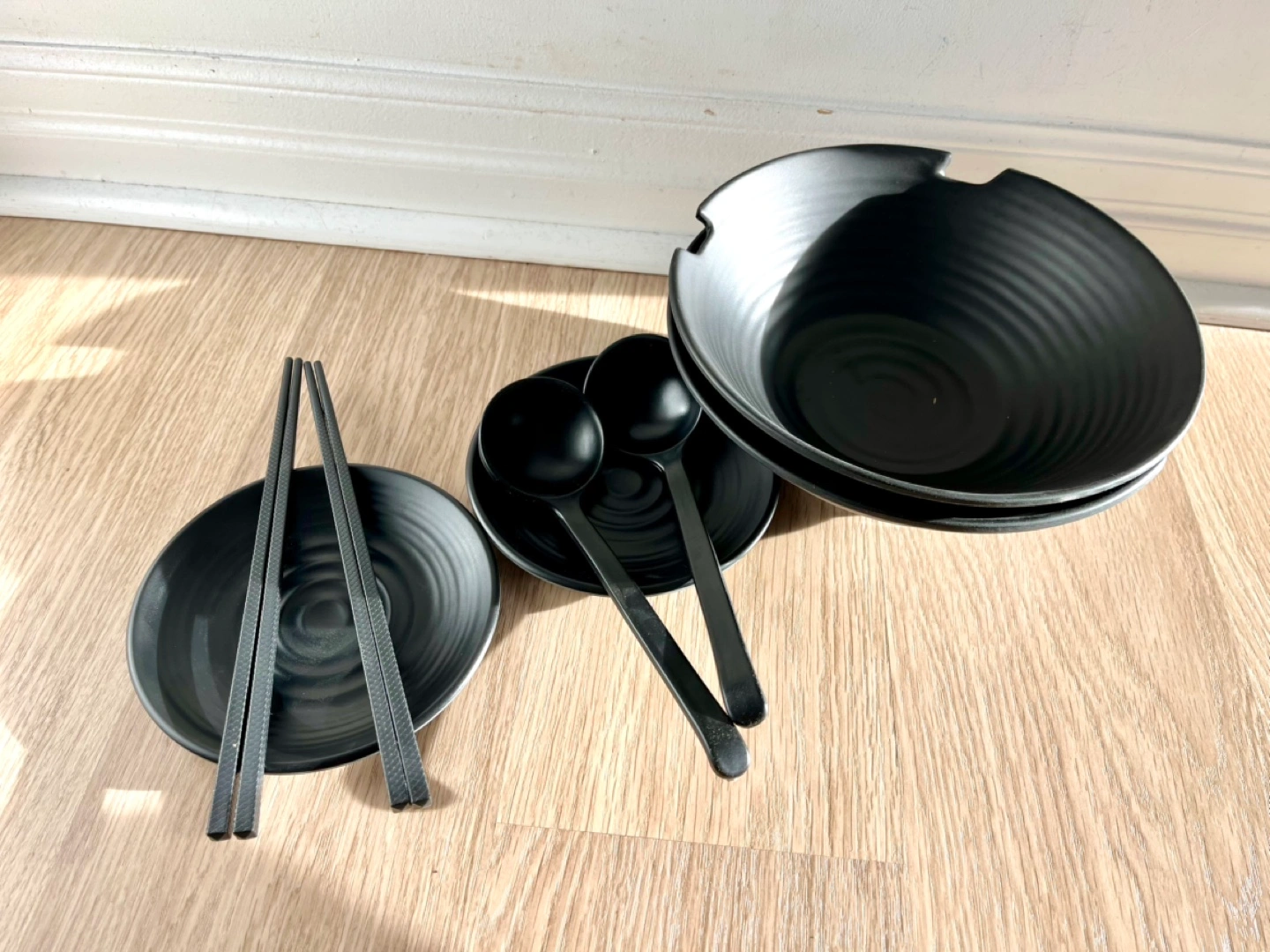 Brand new ramen bowl set. Includes two bowls (37oz), 2 spoons, 2 small plates, and chopsticks. Perfect for ramen or other dishes.