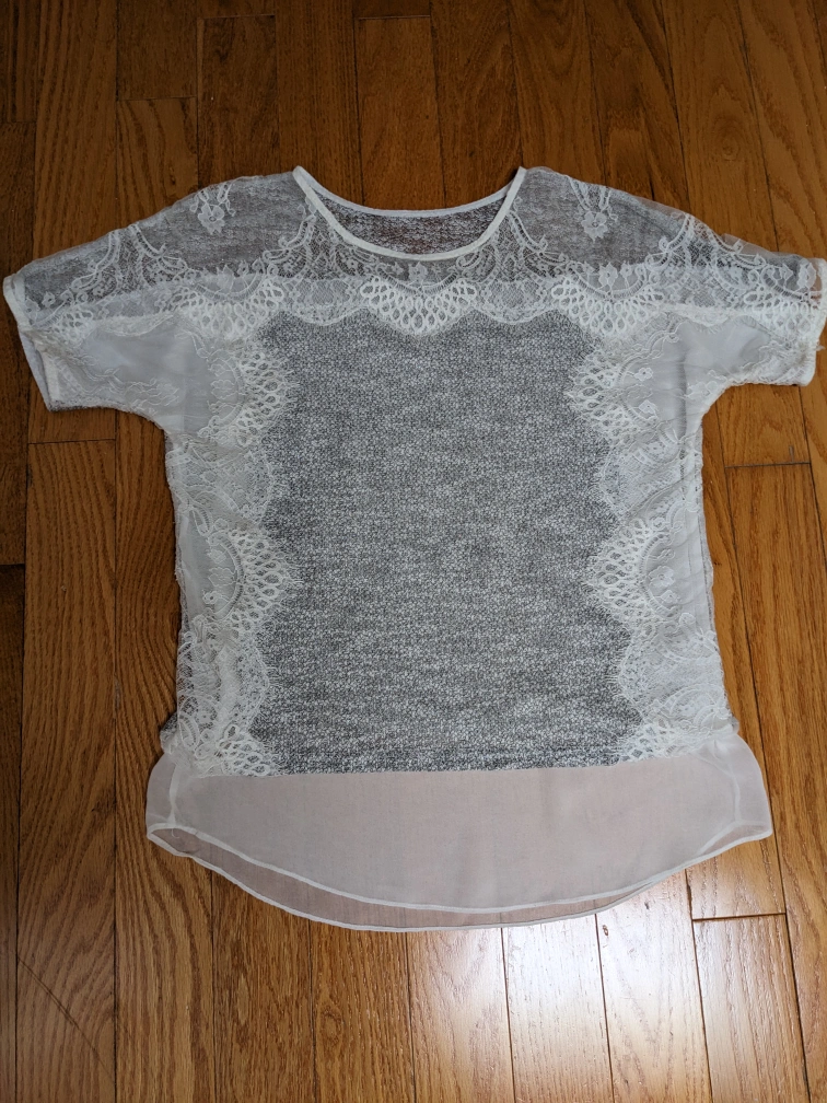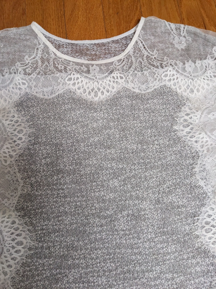 1000+Short sleeve top with grey and white lace detailing and inlay. Looks very beautiful.