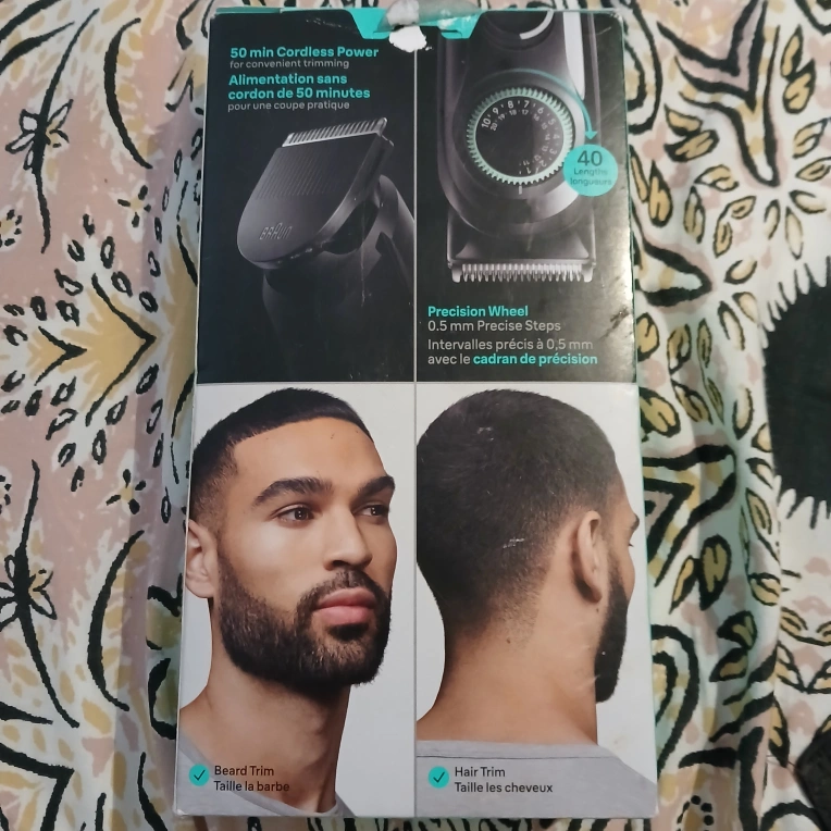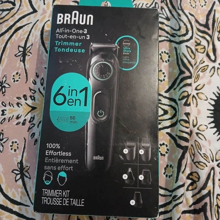 New Braun All-in-One 3 trimmer. Six attachments included. Cordless operation, 50 minutes of runtime. Precision wheel for length adjustments. Ideal for beard and hair trimming.