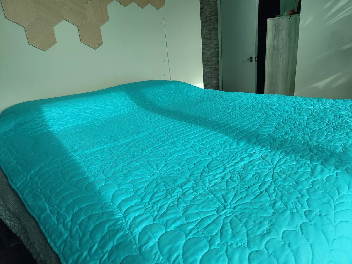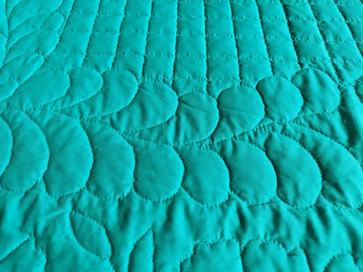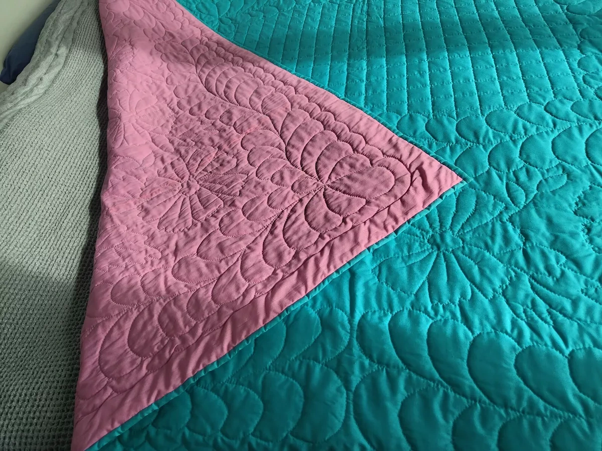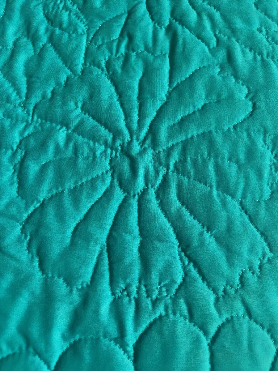 Primary Side: A dazzling azure blue that commands attention, enhanced by intricate rocking-stitch quilting in a Dresden plate-inspired pattern. The detailed stitching provides depth and texture, adding layers of sophistication to this statement piece.