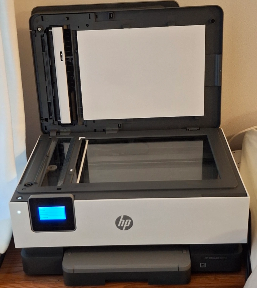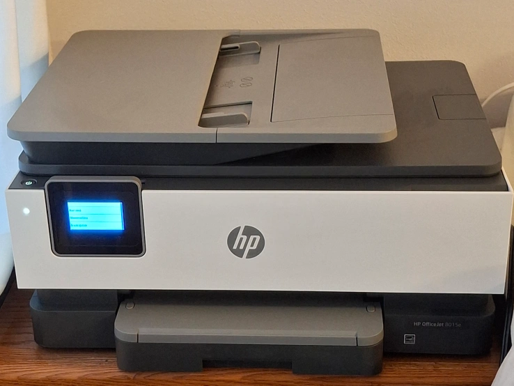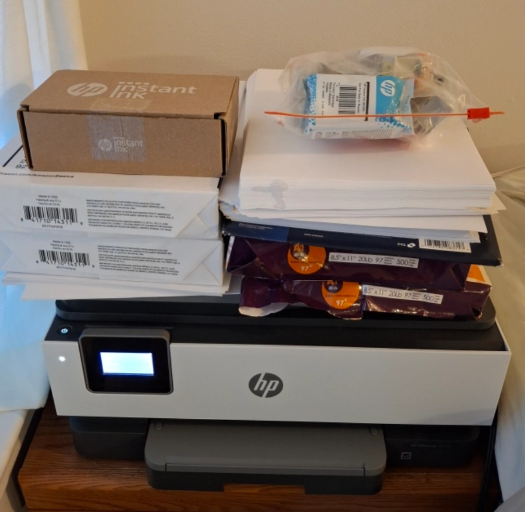 87HP OfficeJet 8013 all-in-one printer. Includes extra ink and paper. Wireless printing capability. Scanner and copier functions. Good condition.