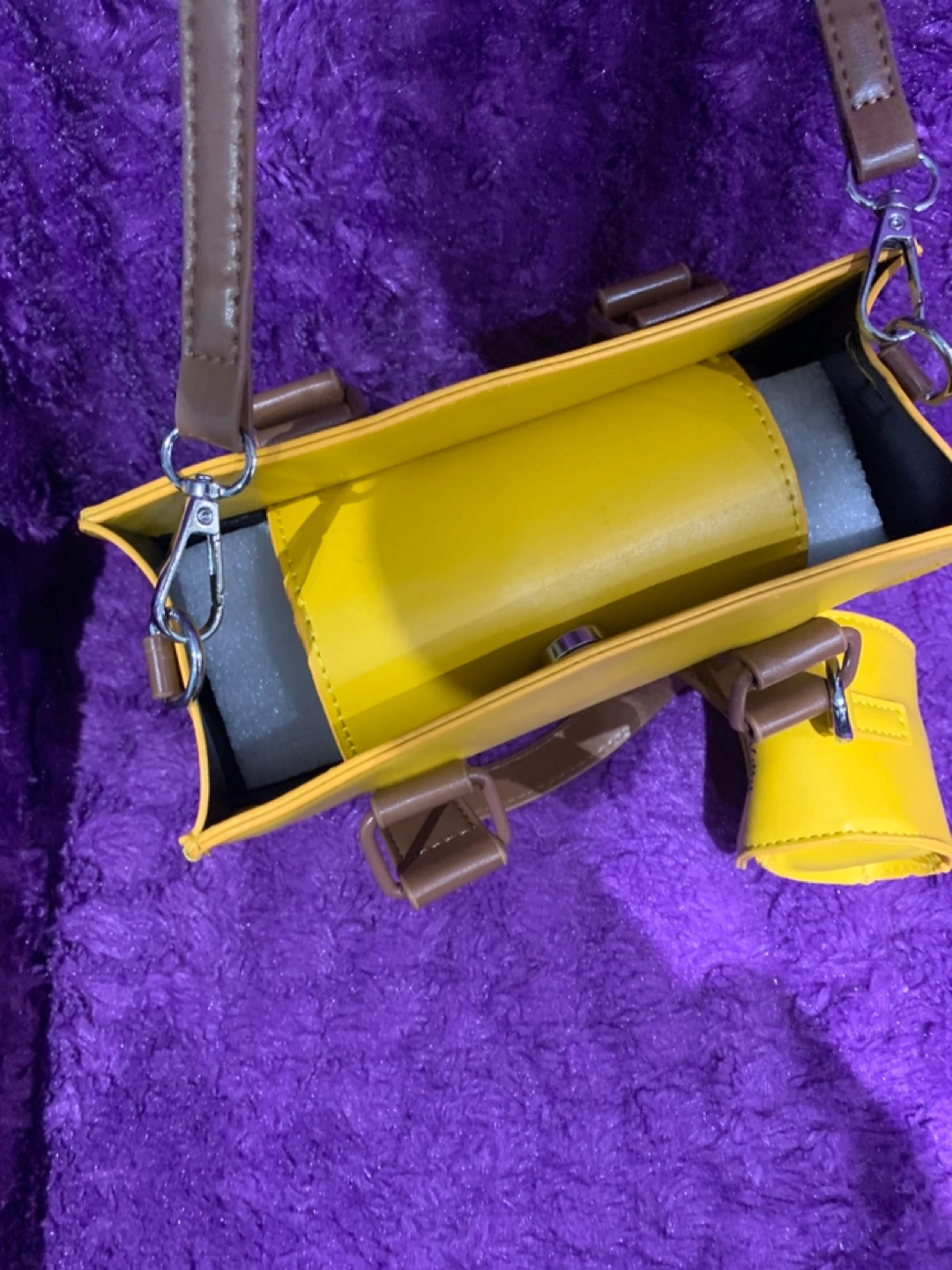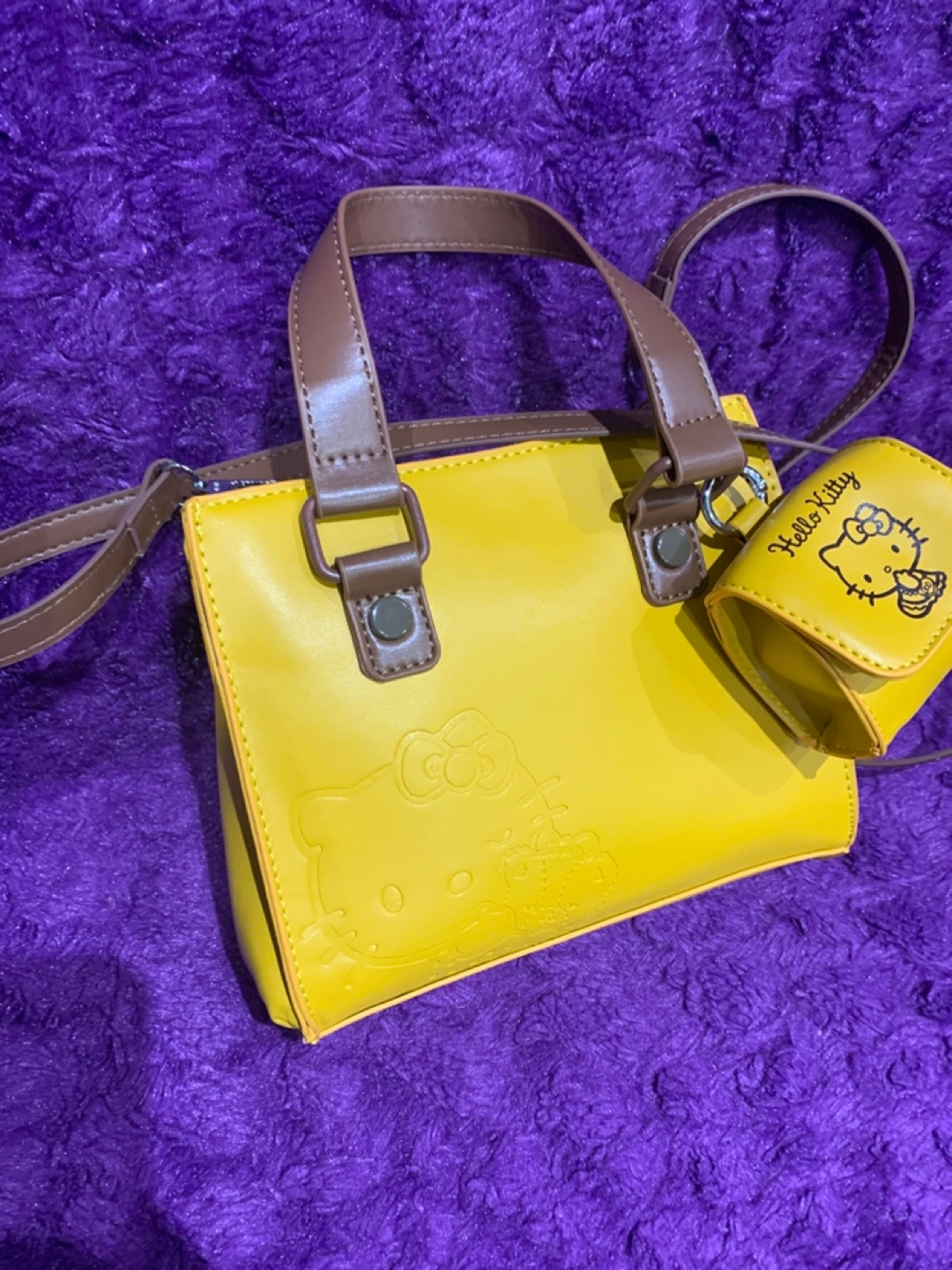 Adorable Hello Kitty handbag. Mustard yellow with brown accents. Includes a smaller matching pouch. Features both a top handle and a detachable shoulder strap. Perfect for everyday use.