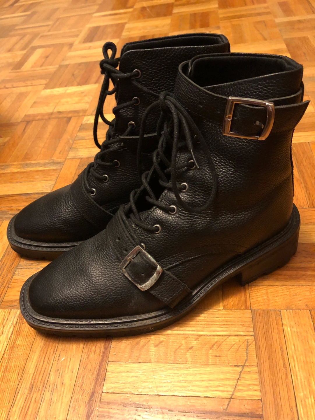 Women's black leather ankle boots. Lace-up and buckle closure. Slightly worn, good condition. The back buckle can be off/on to fit your needs