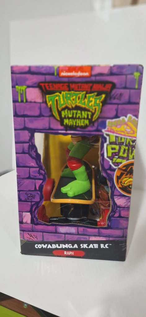 New in box. 12 Inch Raphael action figure on skateboard. Part of the Teenage Mutant Ninja Turtles Mutant Mayhem line. Remote control features. Suitable for ages 5+
