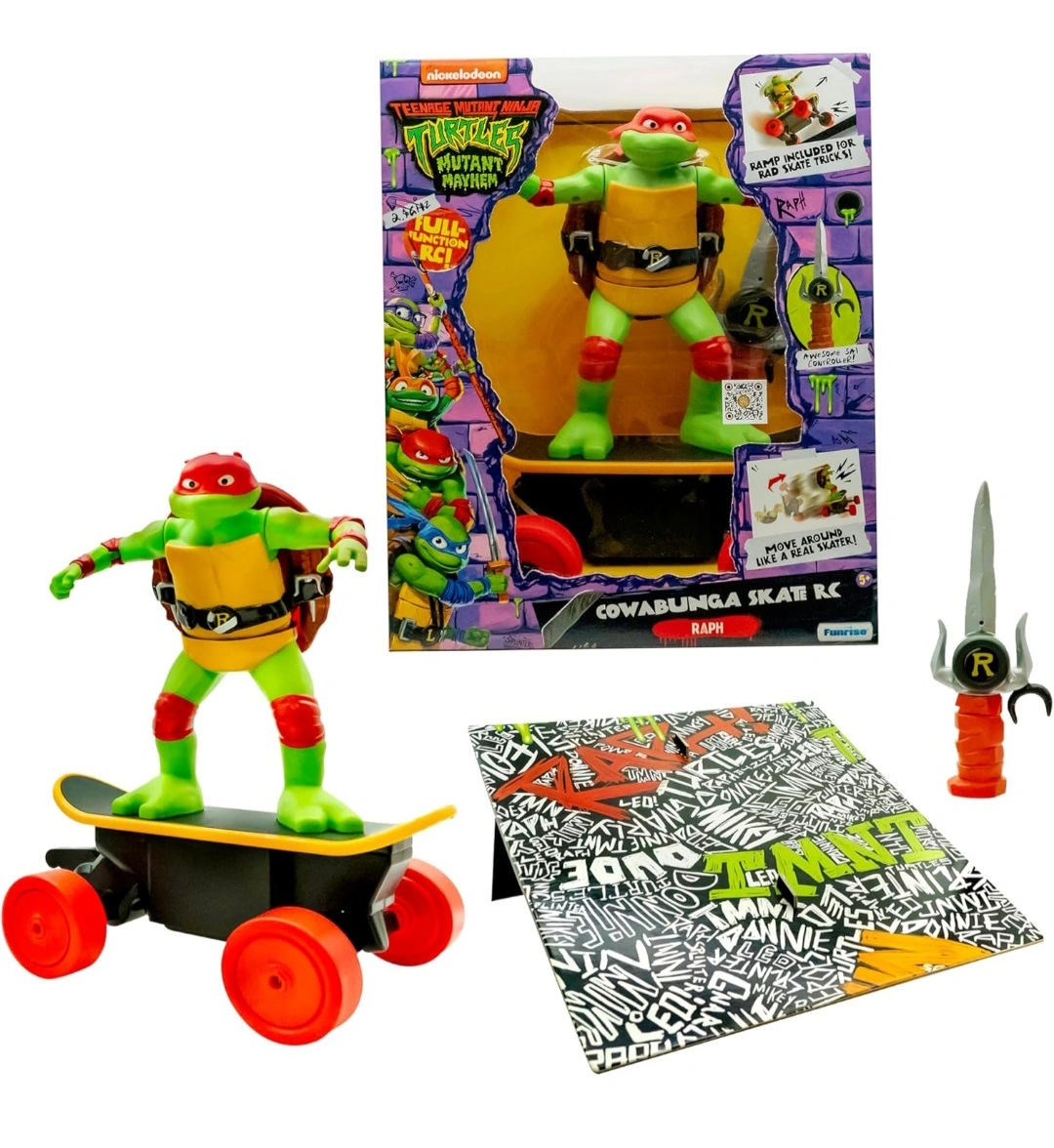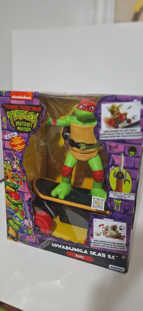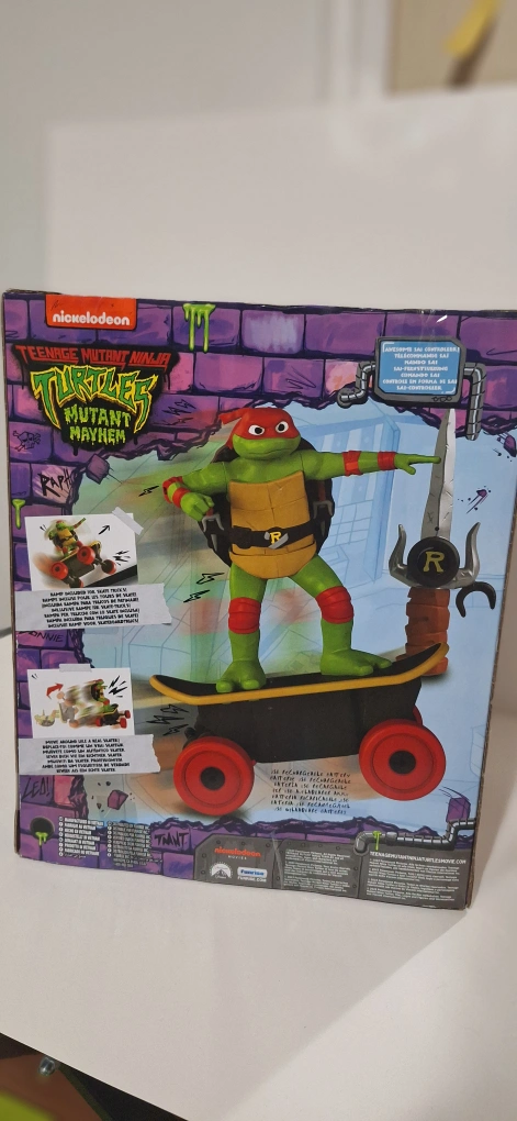 New in box. 12 Inch Raphael action figure on skateboard. Part of the Teenage Mutant Ninja Turtles Mutant Mayhem line. Remote control features. Suitable for ages 5+