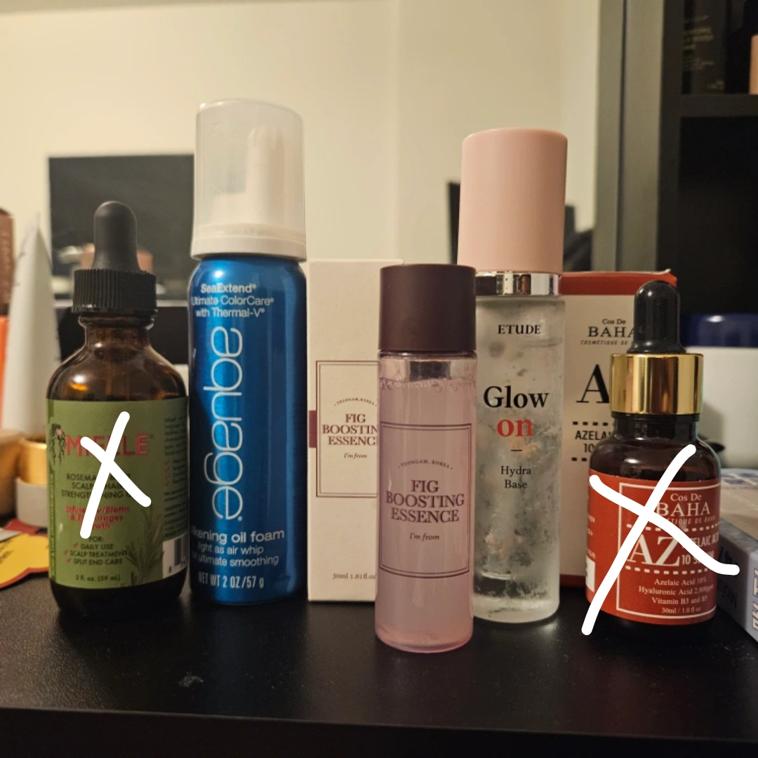 Bundle includes various skincare and haircare products. ⭐ Mielle Rosemary Mint Strengthening Oil 30 ml remaining SOLD ⭐ Aquage Silkening Oil Foam 57g used once, ⭐ Etude House Glow On Hydra Base 30ml used a couple of times ⭐ Cos De Baha Azelaic Acid 10% Serum 30 ml used a couple of times SOLD ⭐ I'm From Fig Boosting Essence 30 ml used once, expires October 2025 Pick up in North York. Can be bundled with other listings. Pet and smoke free household