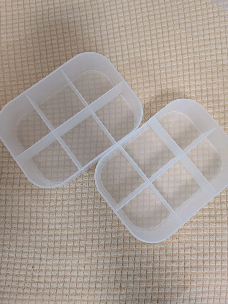 Set of two translucent plastic containers. Each has six compartments. Ideal for organizing small items, pills, or jewellery.