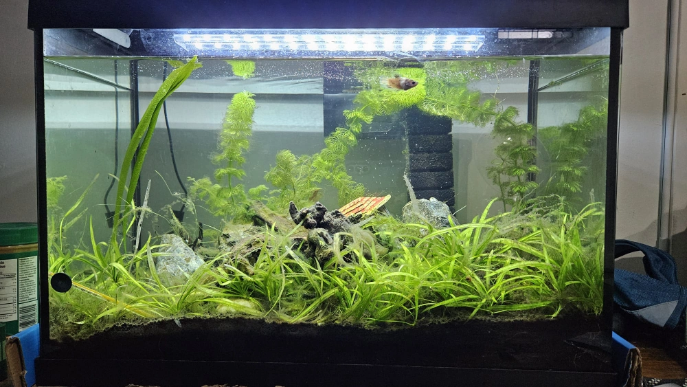 20-gallon aquarium tank, complete setup. Includes LED light, filter, substrate, hardscape, decorations and plants. Great for beginners. Fish not included.