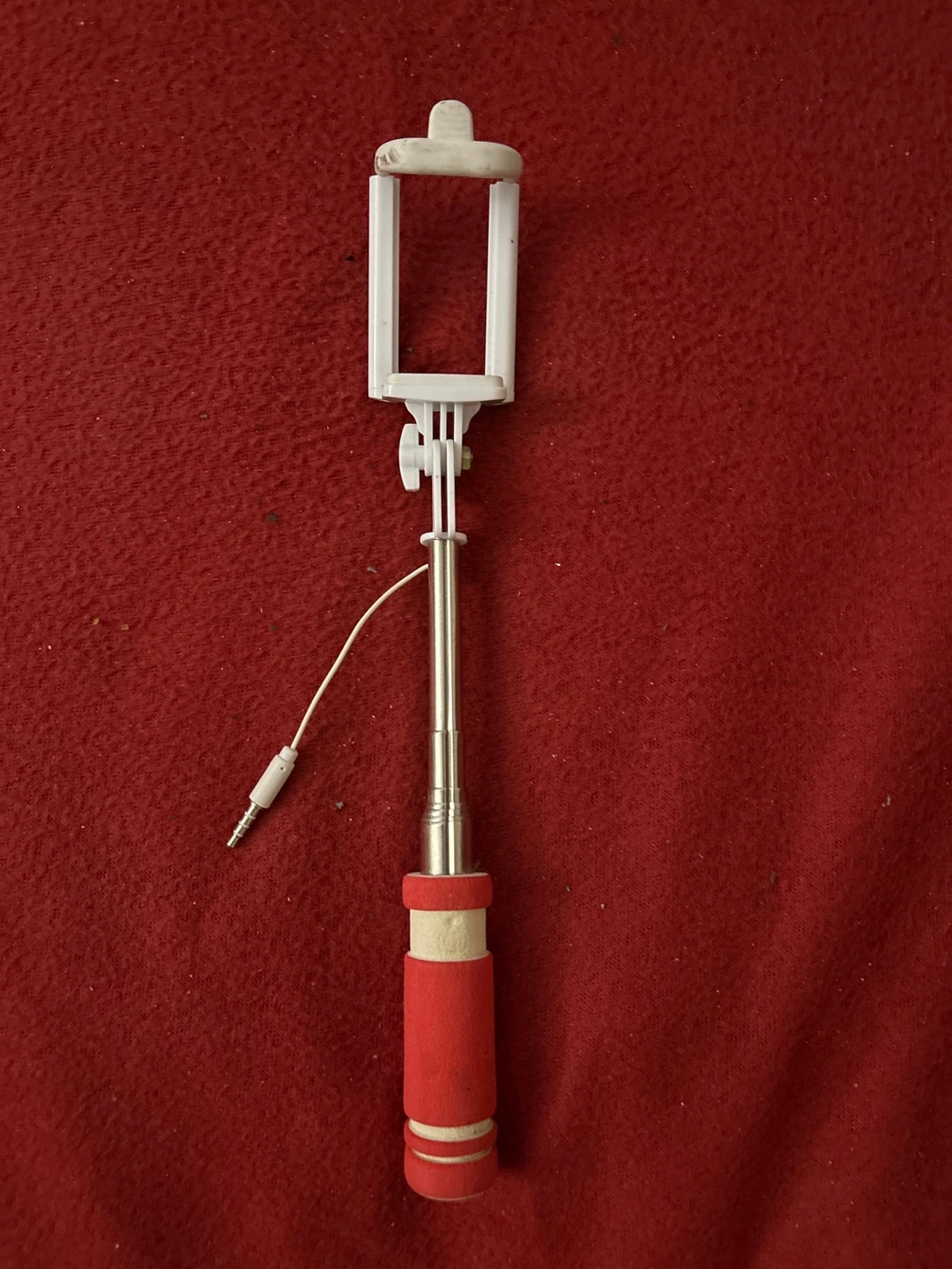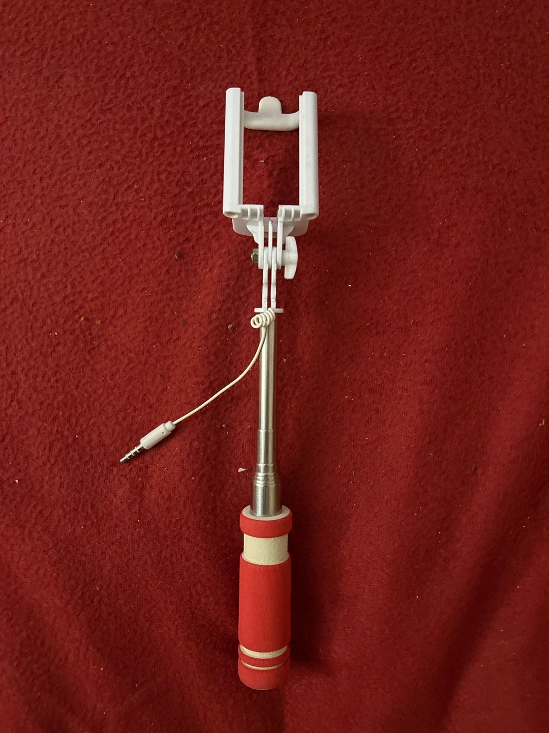 Extendable selfie stick. Features a red foam grip and white plastic phone holder. Wired connection. Great for capturing photos and videos. In a very good condition.