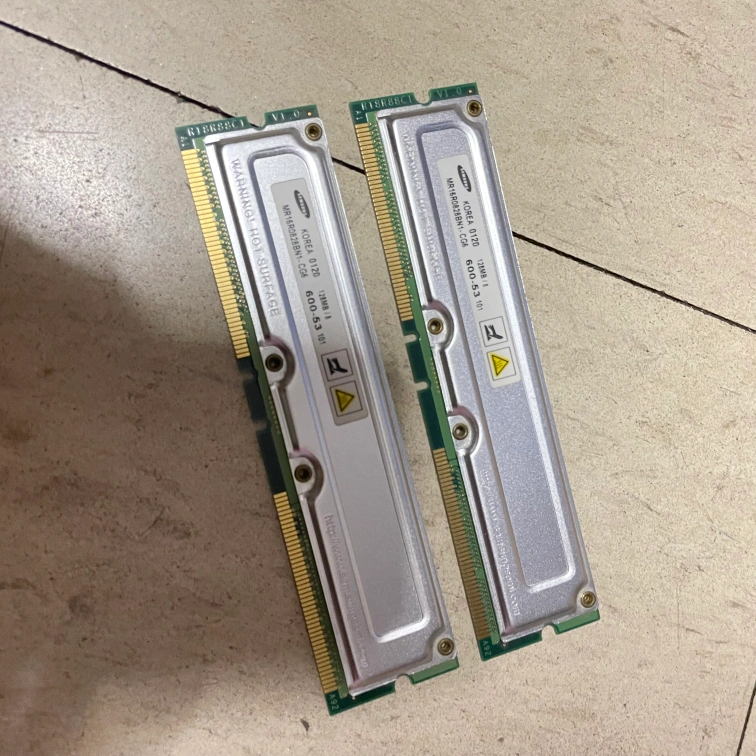 Pair of used Samsung 128MB RAM PC60-53 184 Pin RAMBUS MR160828BN-CG6. Still in Good condition.