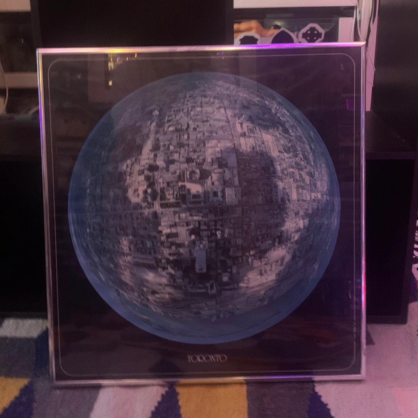 Vintage framed print of Toronto. Silver coloured frame. Image depicts a fisheye view of the city. Great for collectors or urban decor.