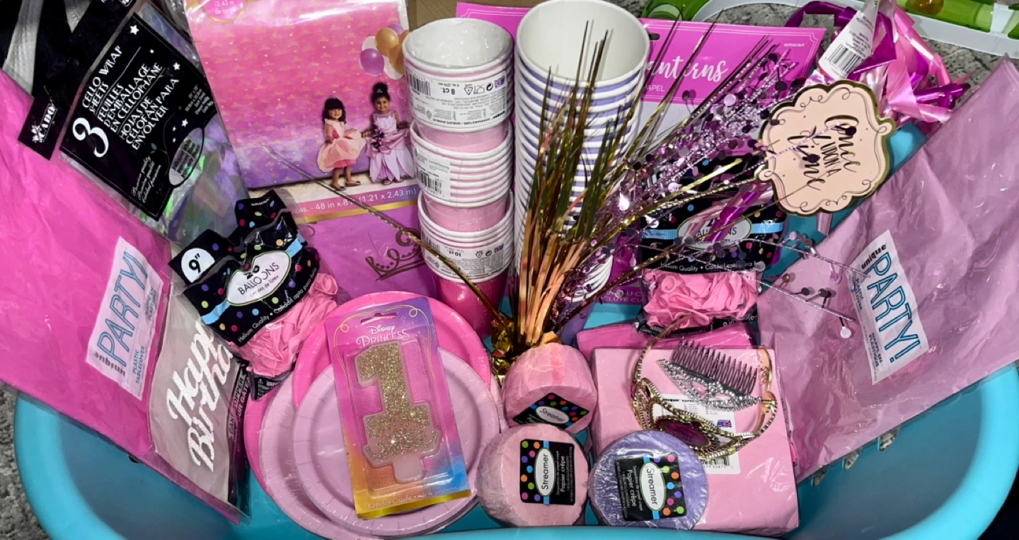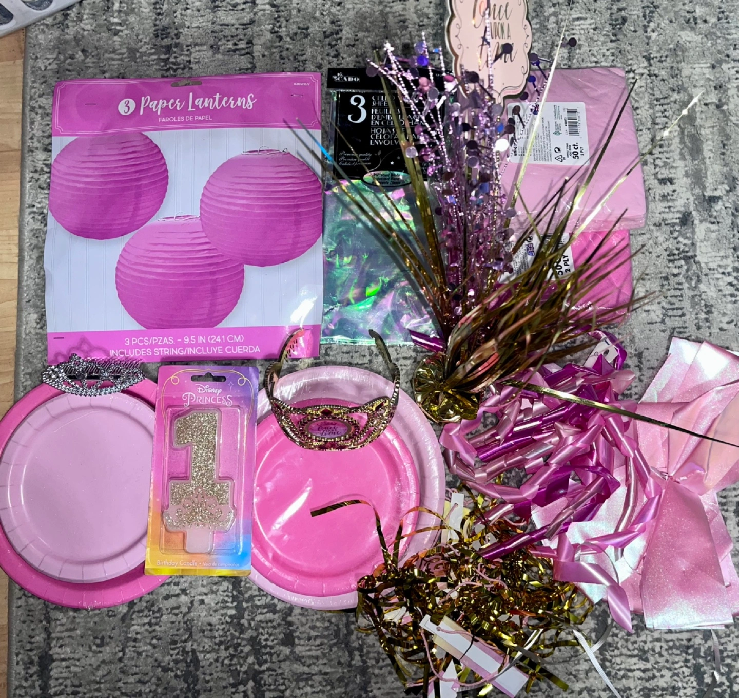 Assorted pink party supplies, including plates, cups, cellophane bags, streamers, balloons, table cover, and more. Perfect for a birthday party, or young girl birthday party. Includes 1 Disney Princess candle and additional hello kitty cups and plates.