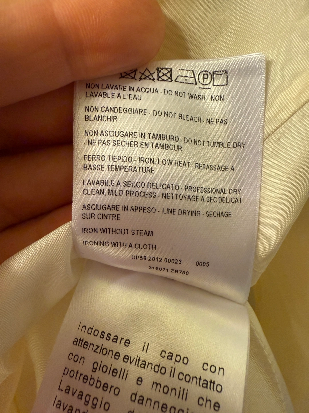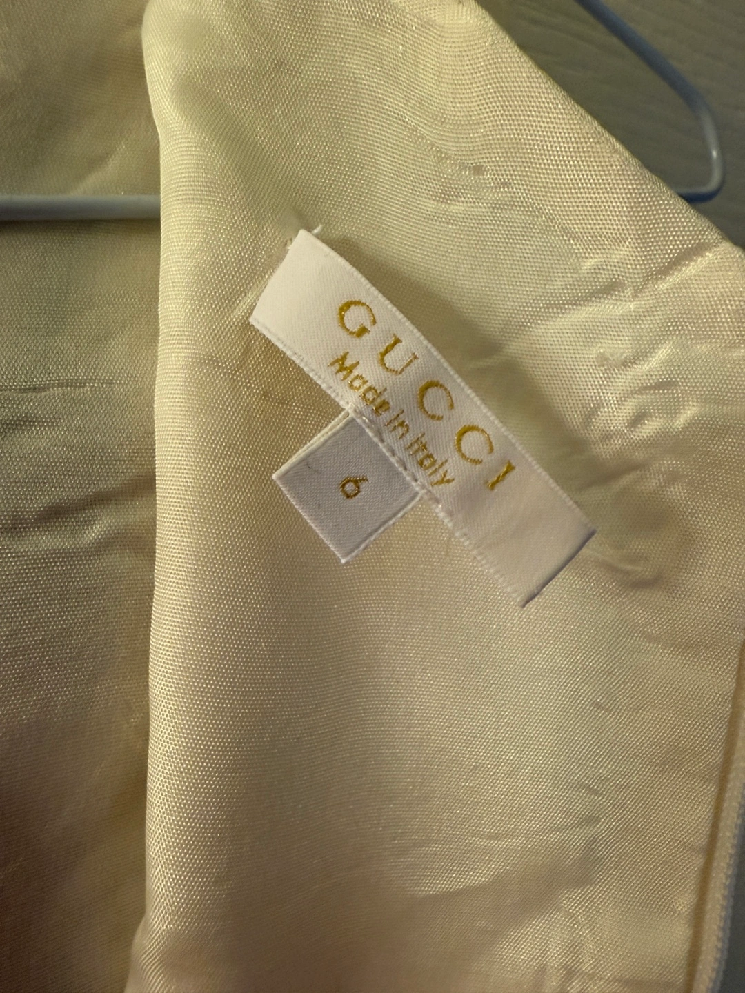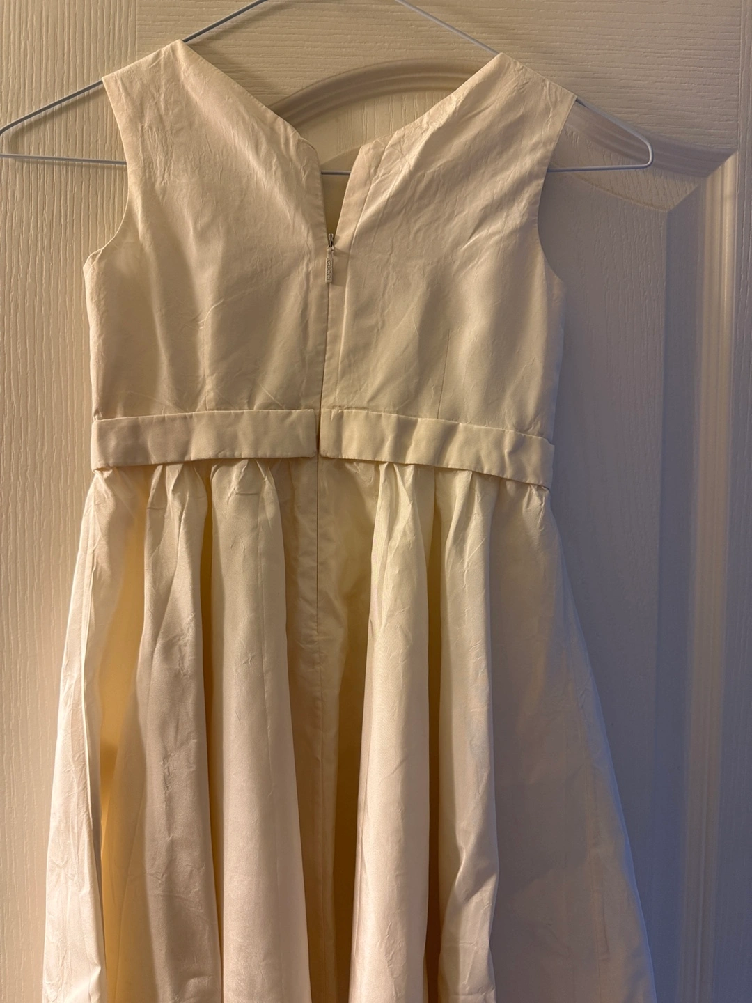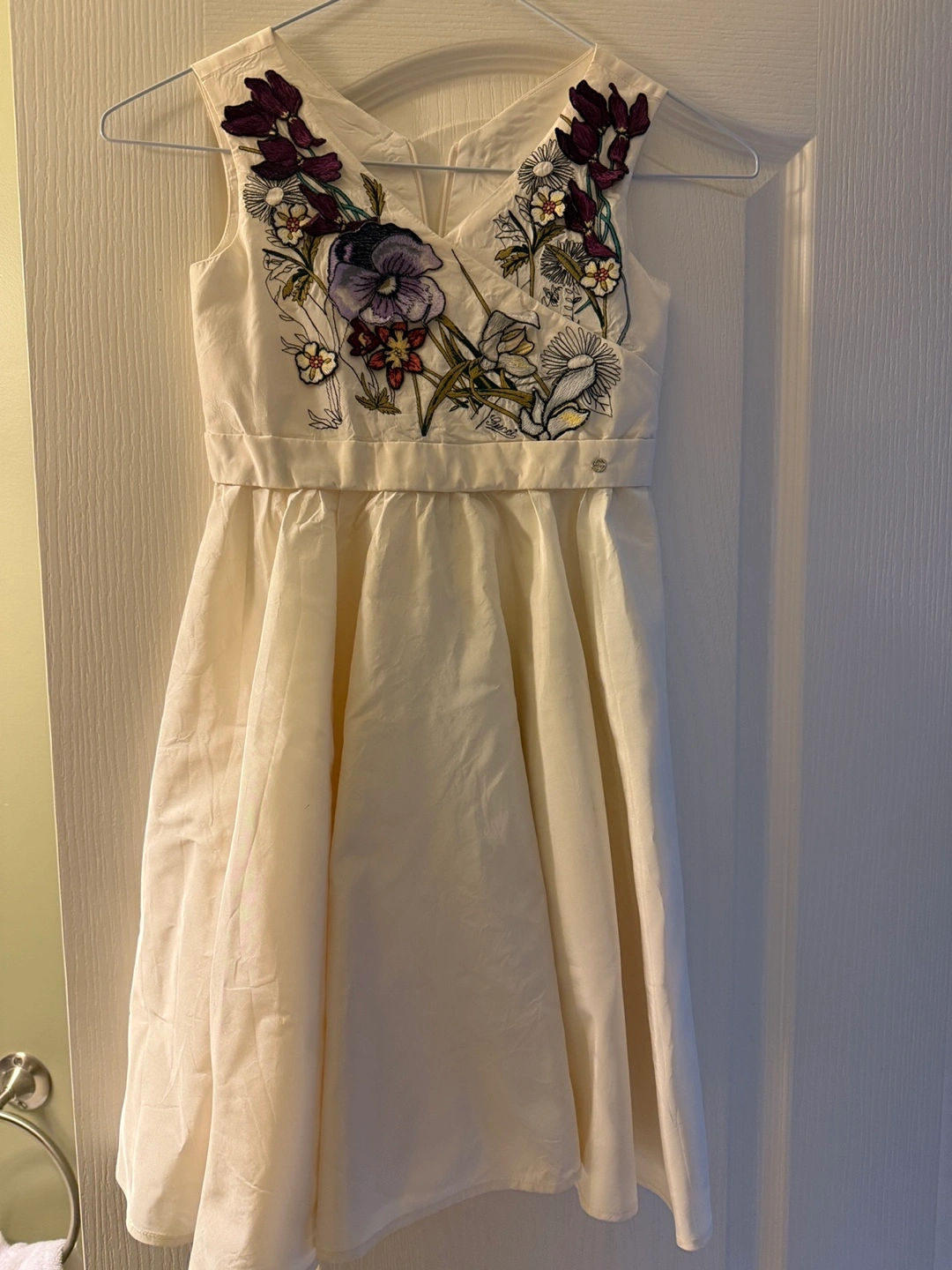 Silk Adorable off-white sleeveless dress. Features a v-neckline and floral embroidery. Back zipper closure. Size 6. Made in Italy.