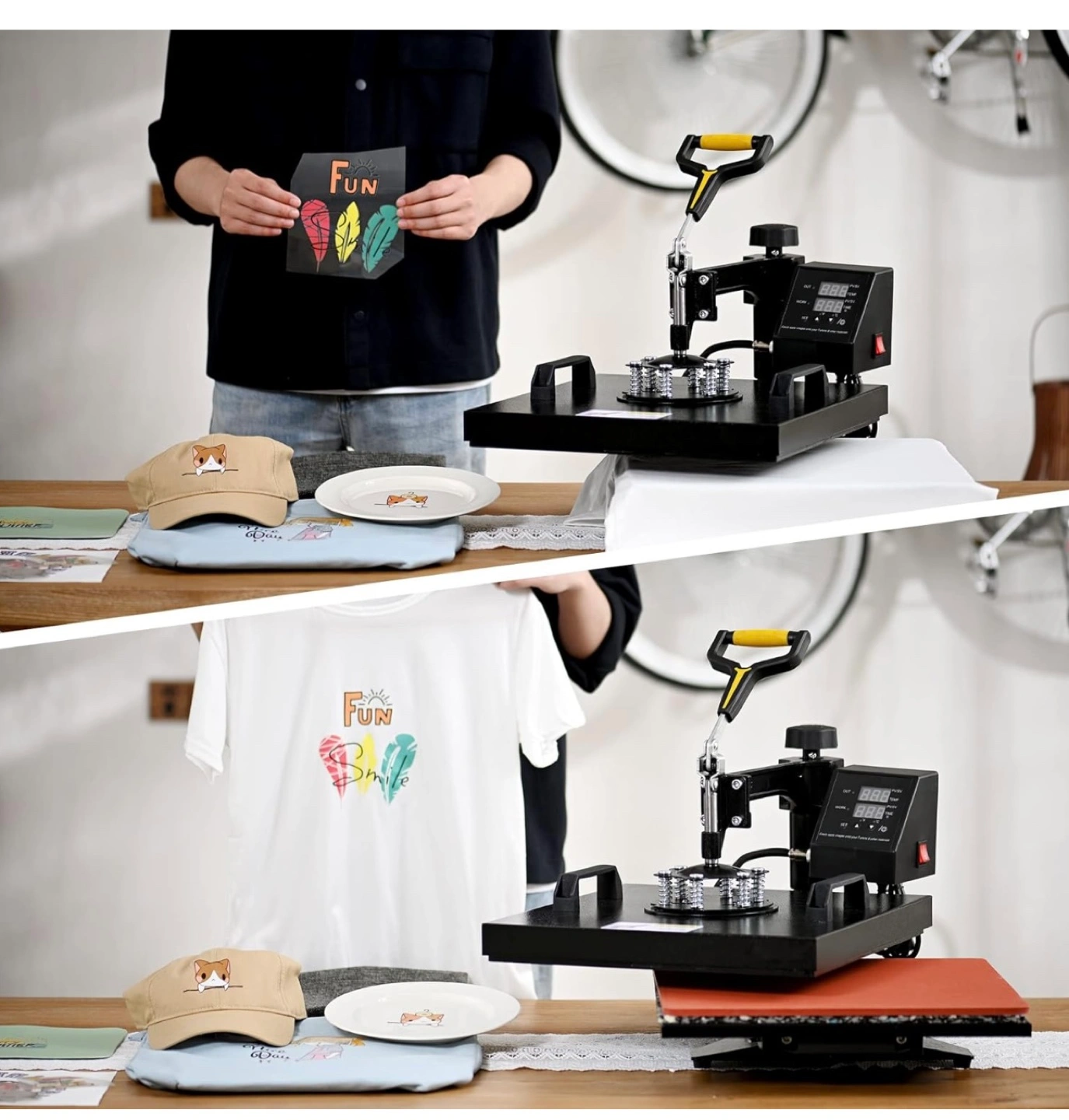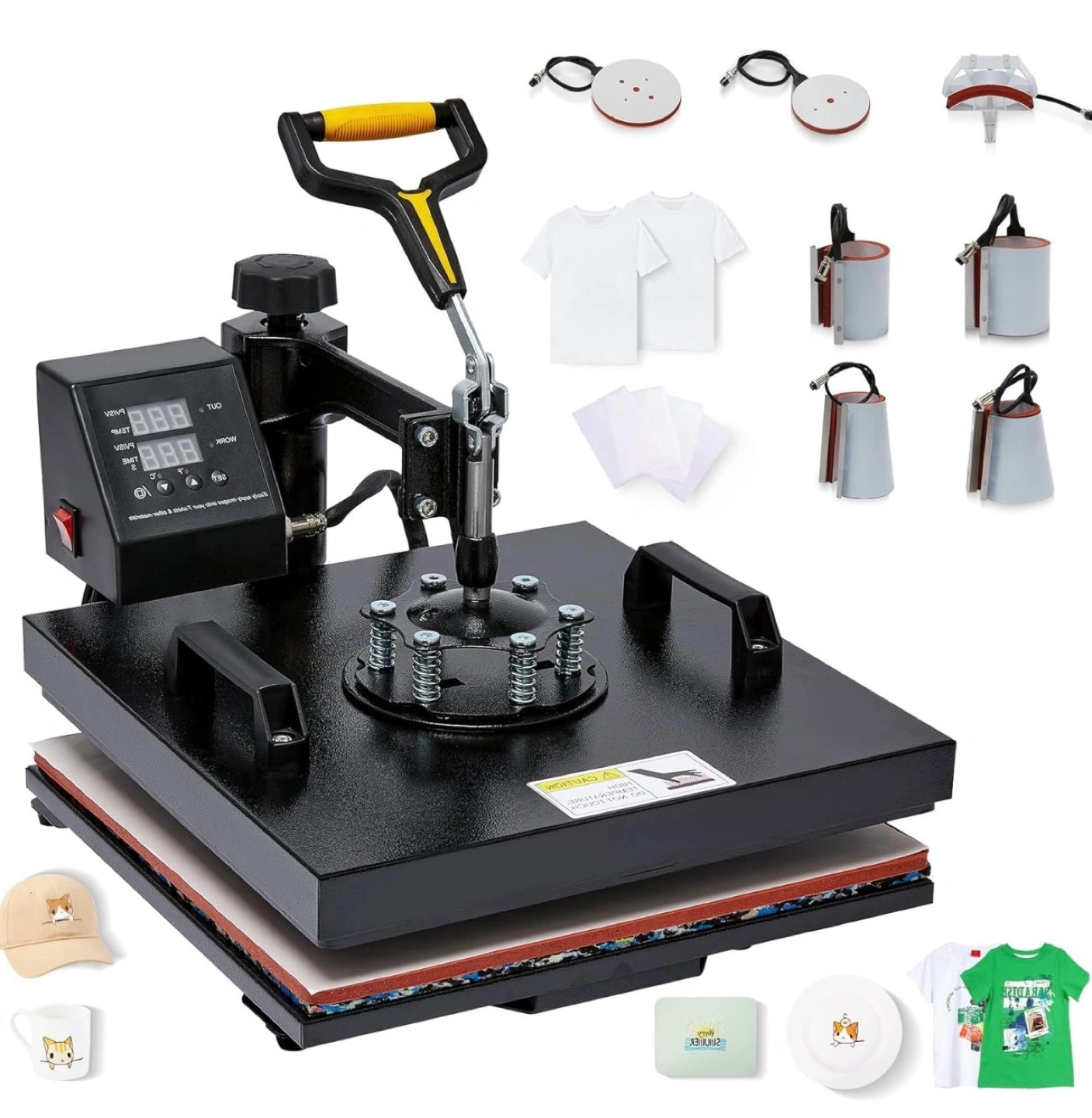 Versatile heat press machine. Includes multiple attachments for various items. Digital temperature and timer controls. Easy to use. Great for custom designs.