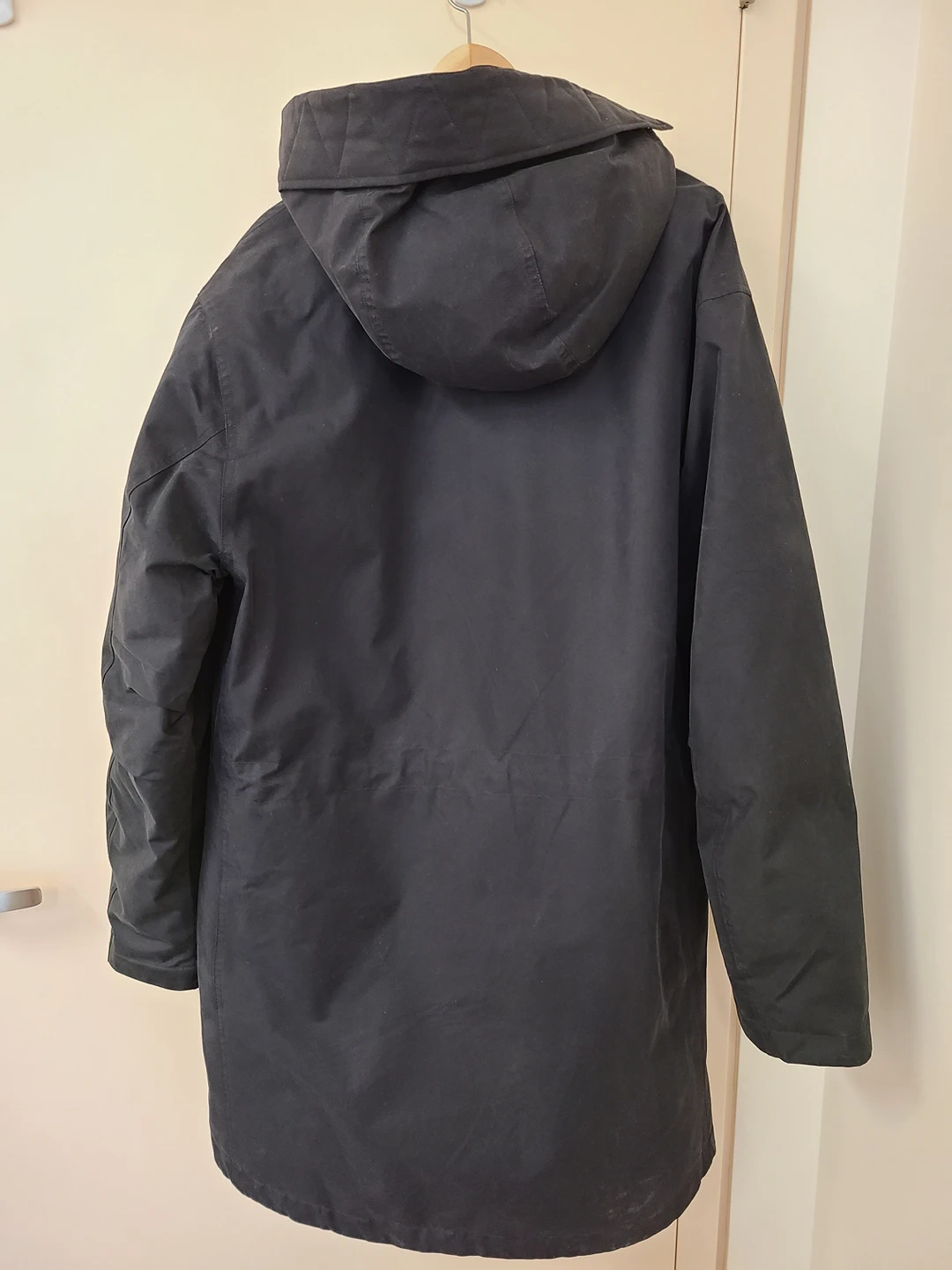 A tough winter parka, with artificial down filling, nylon taffeta lining, ribbed storm cuffs to keep the warmth in, adjustable hood and waist and front closure with hidden two-way personalised zip and snap buttons.