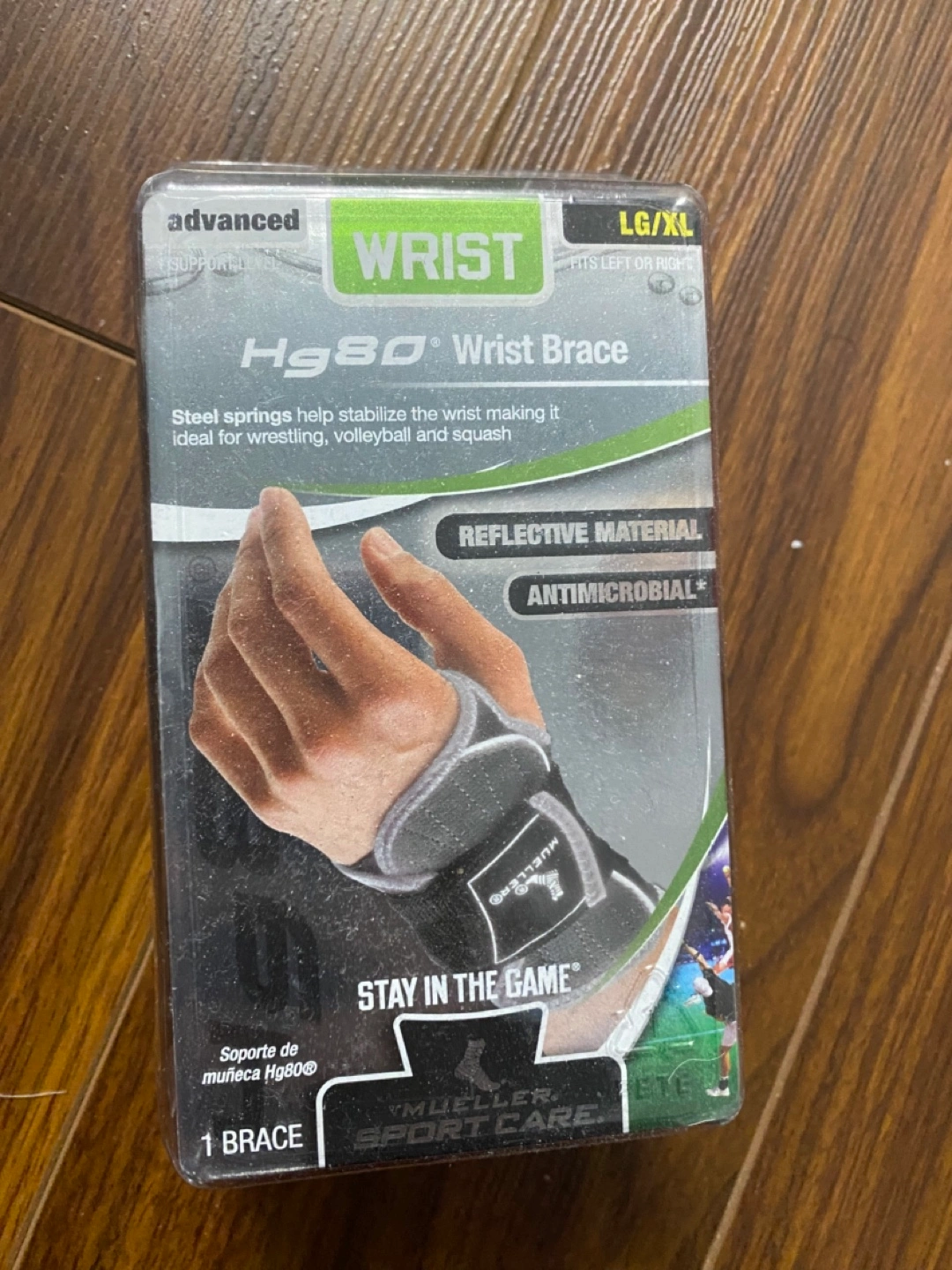 Mueller Hg80 wrist brace. Steel springs for support. Antimicrobial and reflective material. Ideal for wrestling, volleyball, and squash. Large/extra-large size.