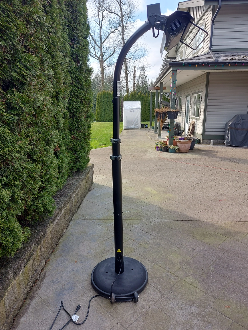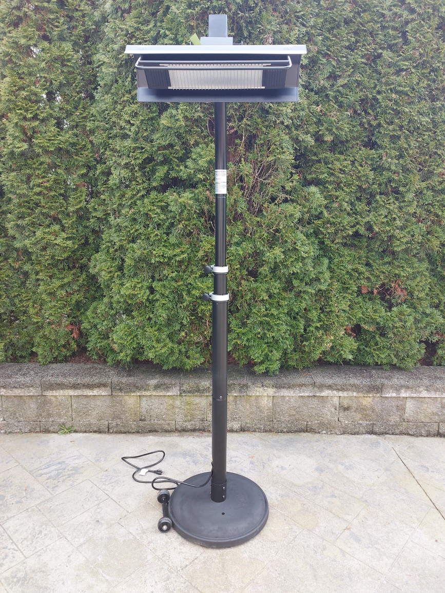 Freestanding patio heater. Black metal construction. Adjustable height. Wheels for easy mobility. Includes power cord.