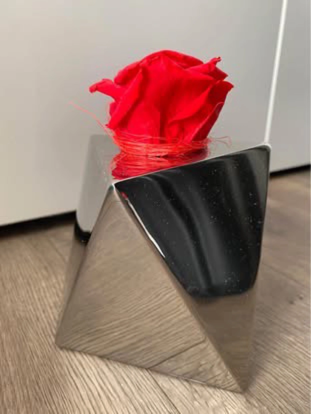 Forever rose unique silver metal holder. Features a geometric, pyramidal design. Perfect for a single preserved rose or other small floral arrangement. Adds a touch of modern elegance to any space.