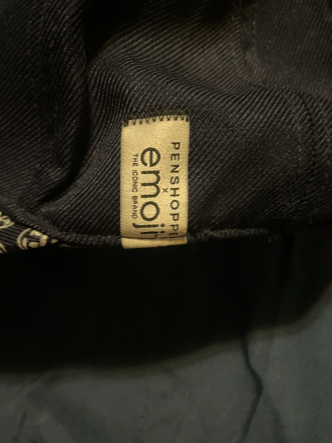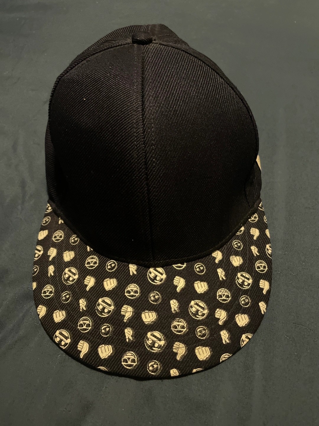 79Black snapback hat. Features an all-over emoji print on the visor. Adjustable closure. Great for casual wear. Adjustable