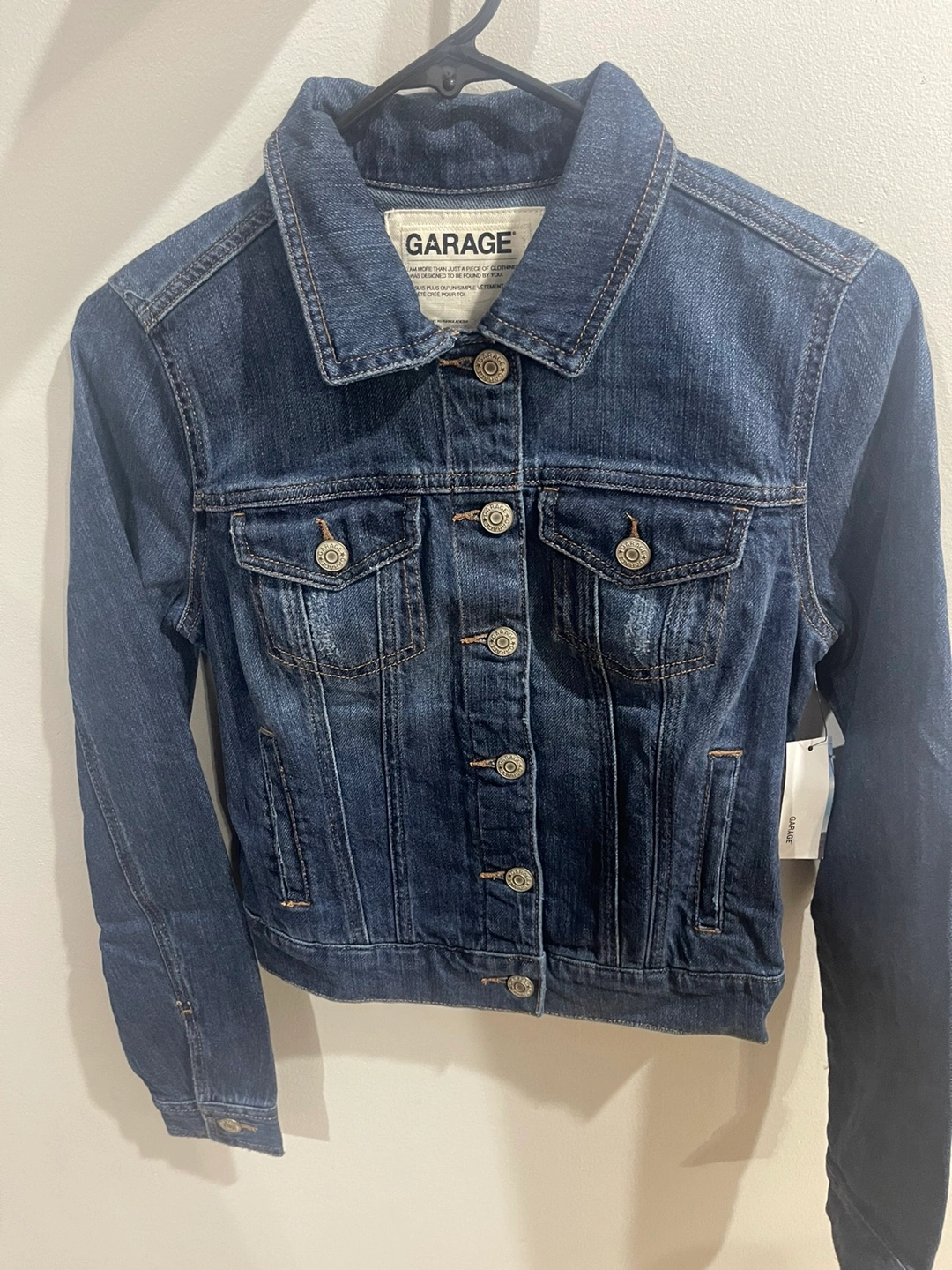 Dark wash denim jacket. Small size. Button closure. Classic style. Distressed detailing.