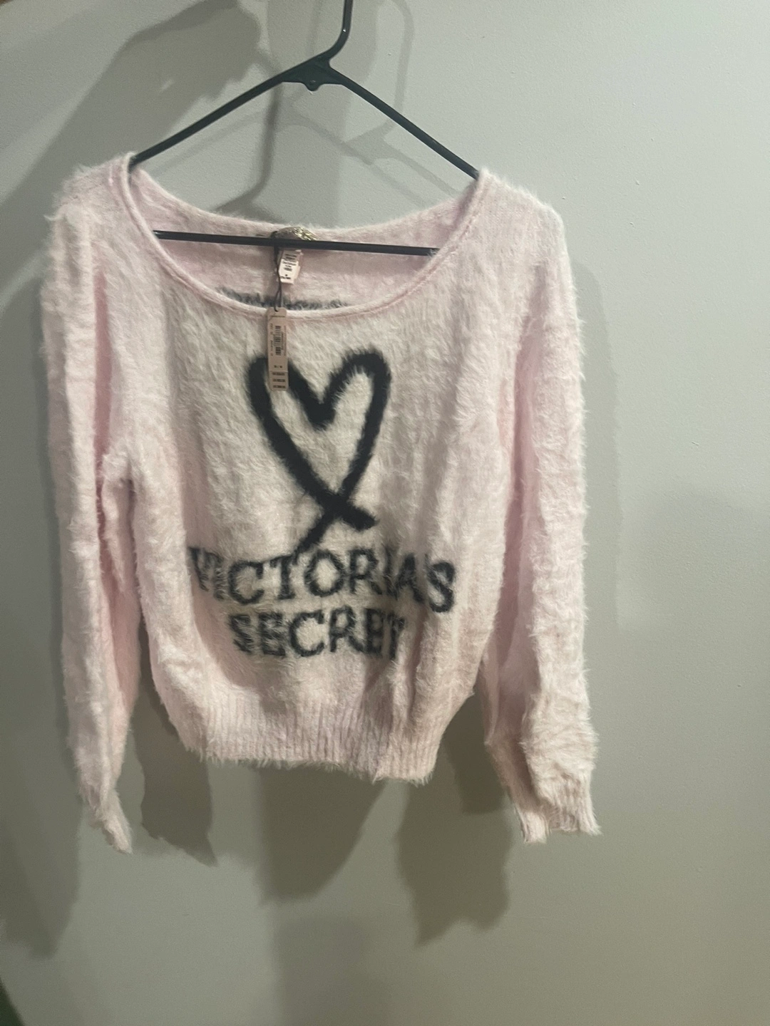 Adorable pink fuzzy sweater. Features a heart and Victoria's Secret logo. Size medium. New with tags.