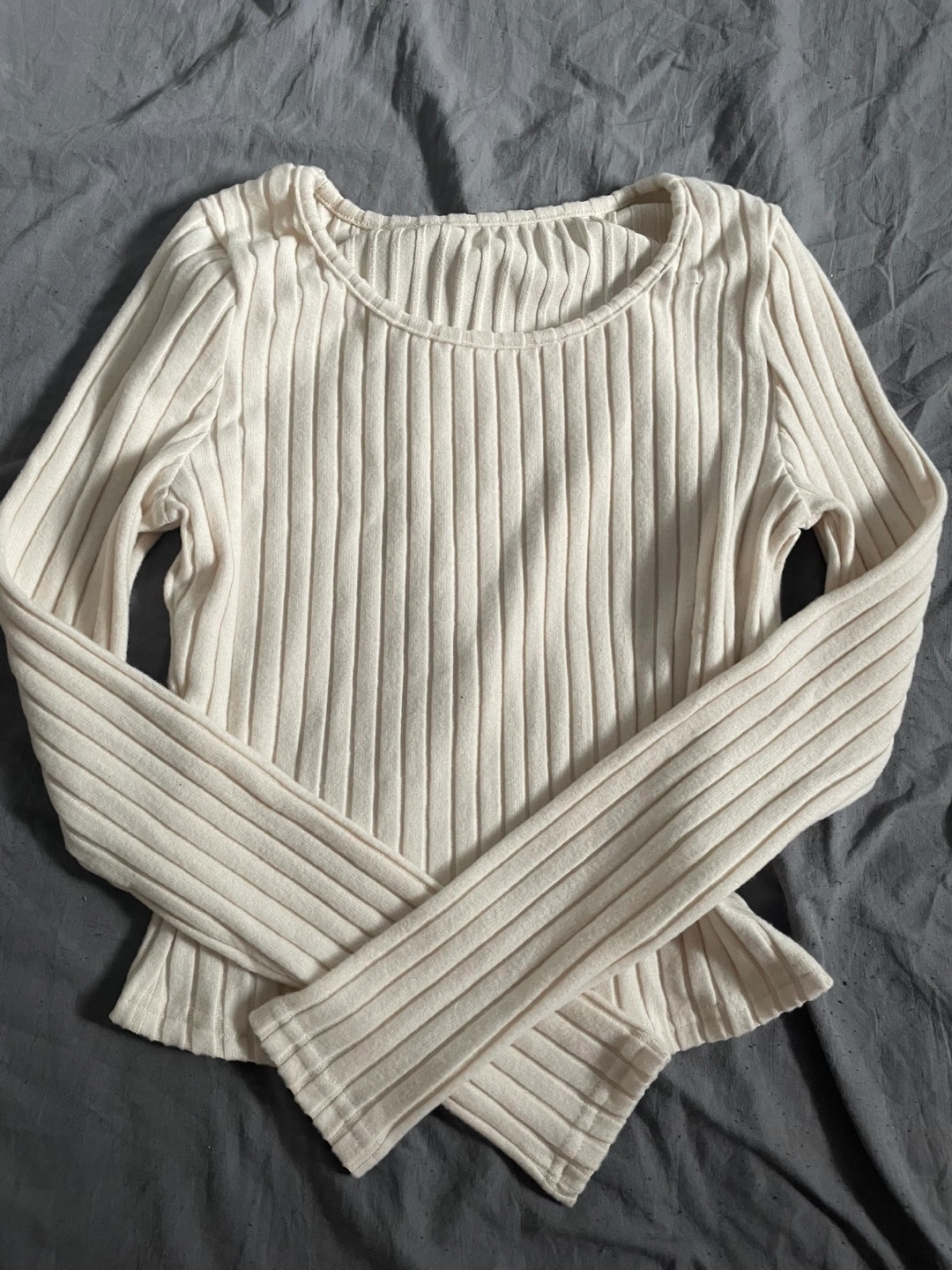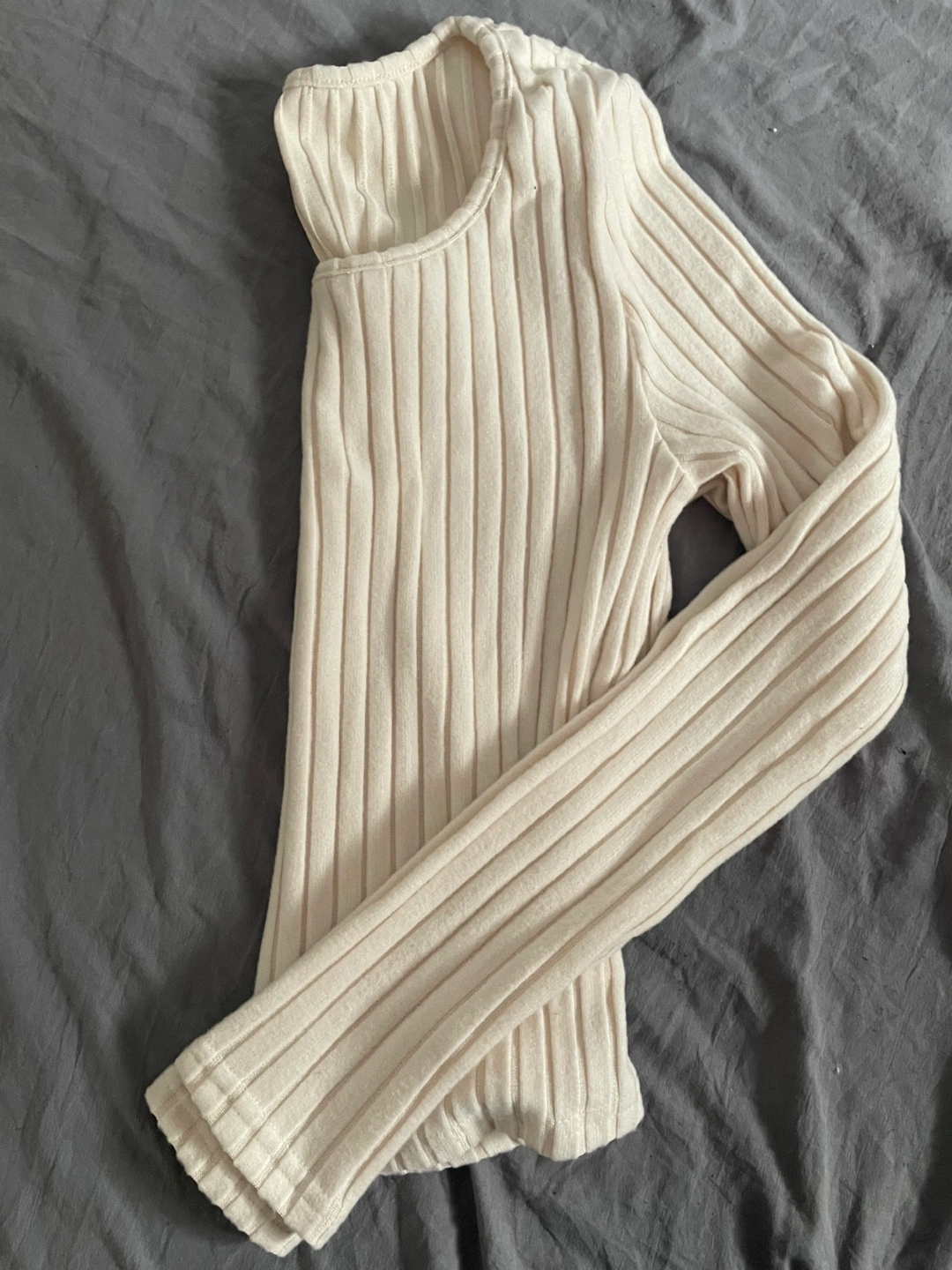 Fitted, long-sleeved, ribbed crop top. Cream or off-white colour. Simple, versatile style. Great for layering or wearing alone.it is new so it has never wore it was just hanging in my closet