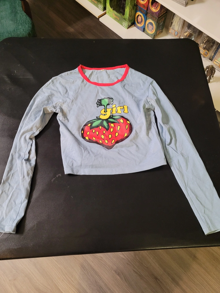 Light blue long-sleeved crop top. Features a cute strawberry graphic with the word "Girl". Red trim around neckline. Size small.