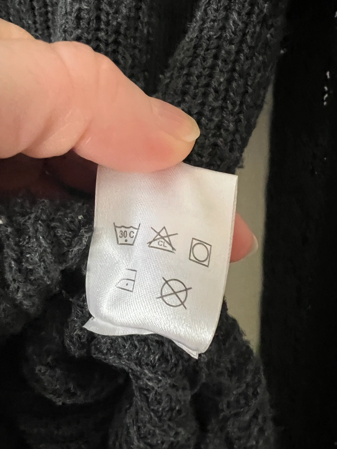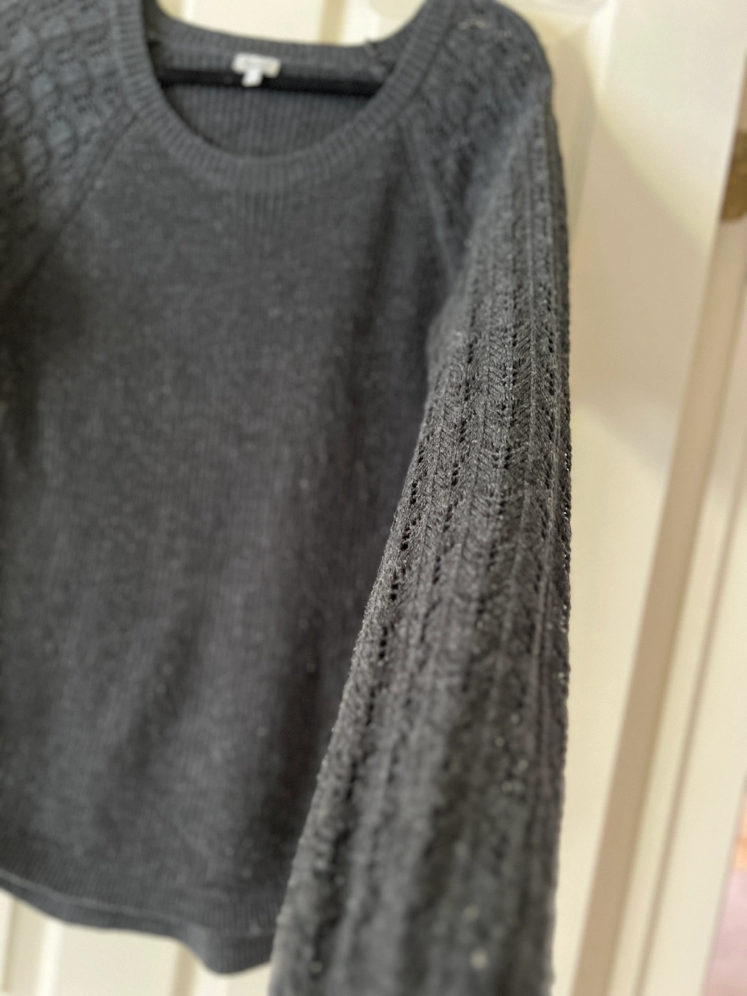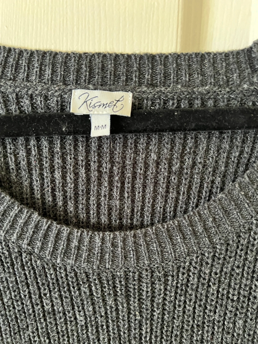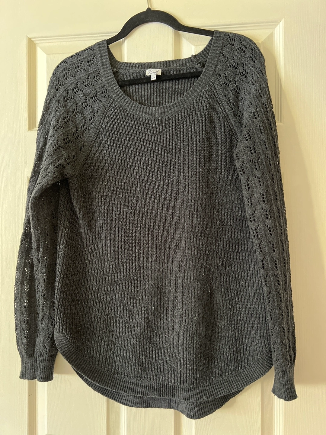 Grey sweater, size medium. Ribbed knit, lace detailing on sleeves. Long sleeves, round neckline. 54% acrylic, 46% cotton. Made in China.