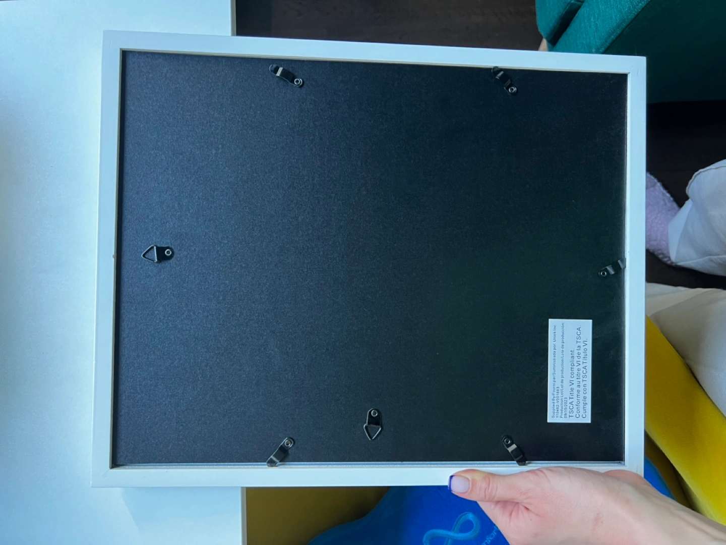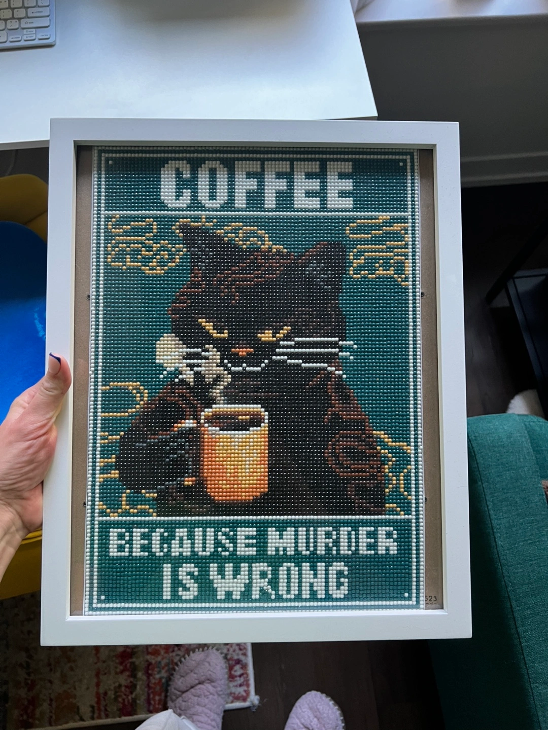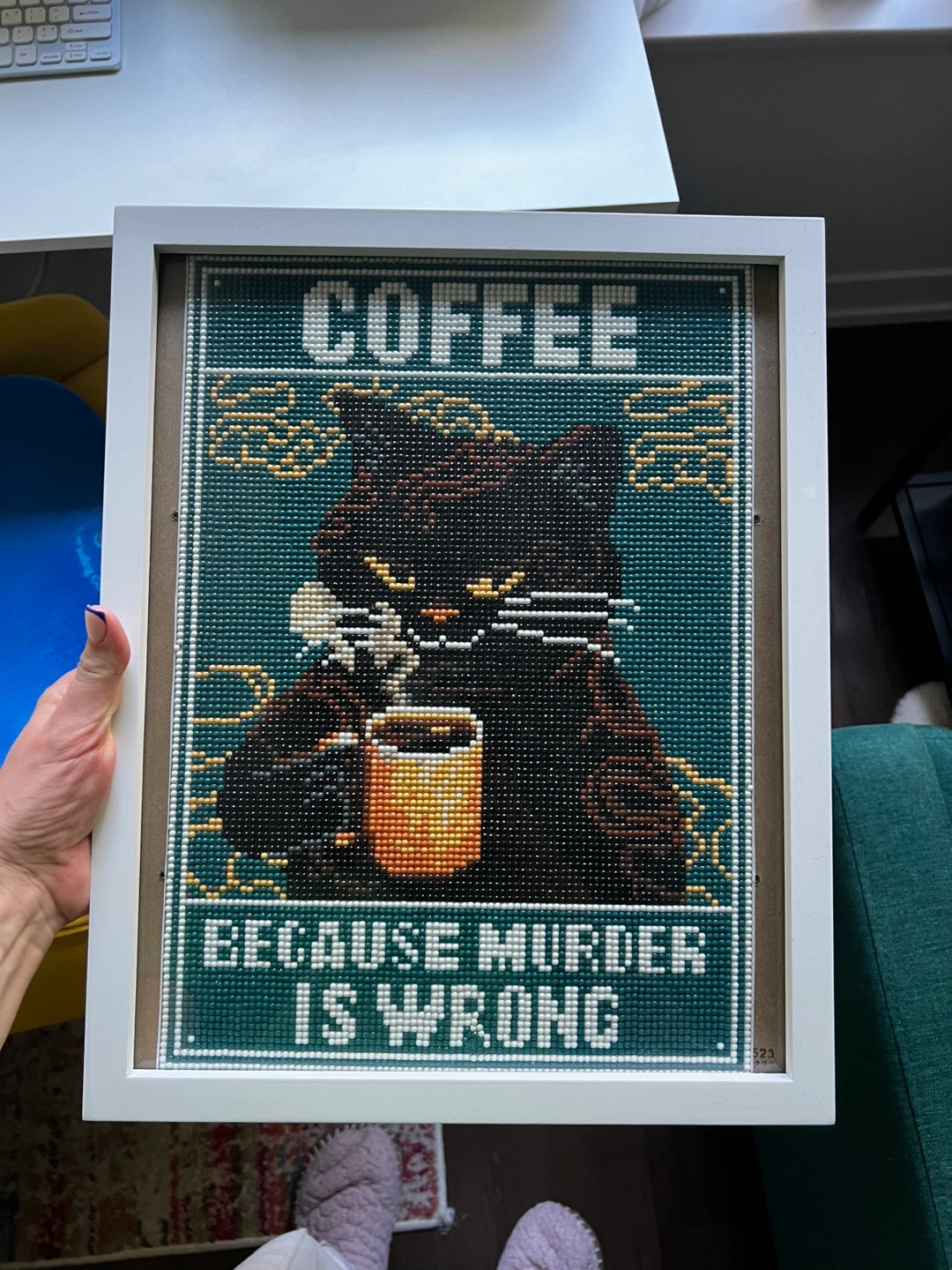 226Cute framed diamond painting featuring a cat and coffee. White frame. Perfect for home decor.
