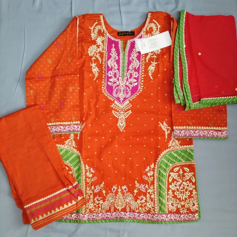 Junaid Jamshed gorgeous orange embroidered 3-piece suit. Includes a kurta, pants, and dupatta. Intricate embroidery details. Perfect for special occasions.
