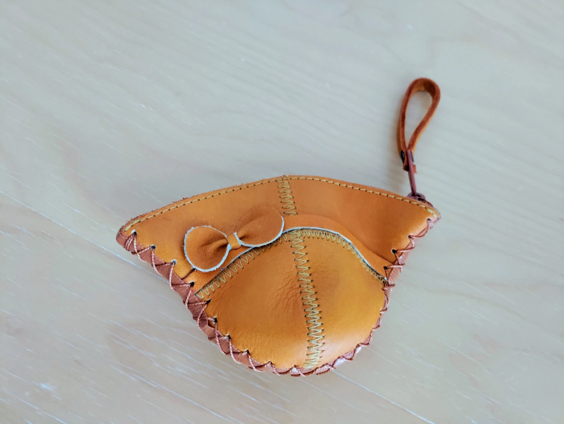 1000+Small, orange leather coin purse. Features a decorative stitched design and a small leather bow. Includes a wristlet strap.