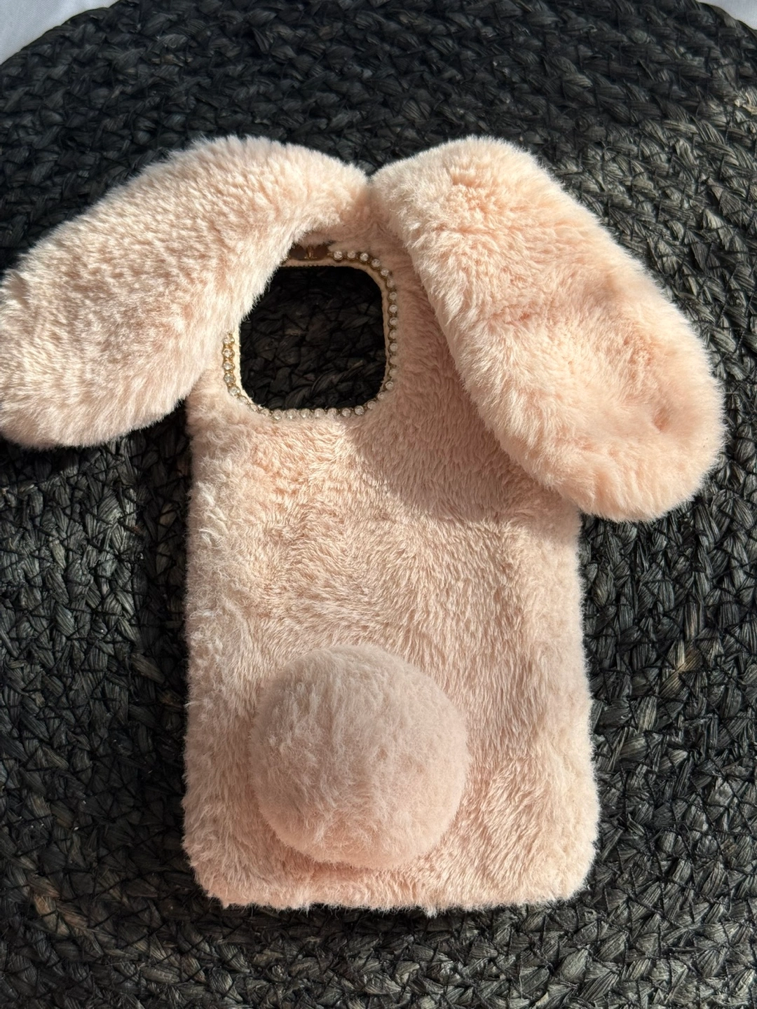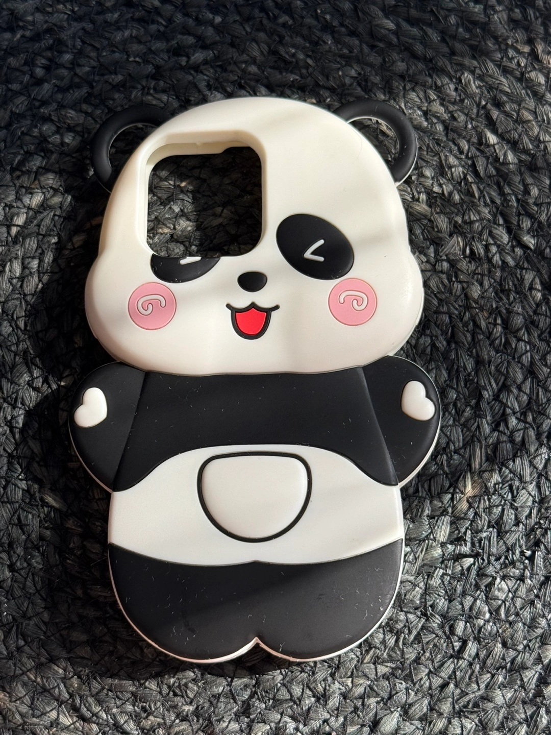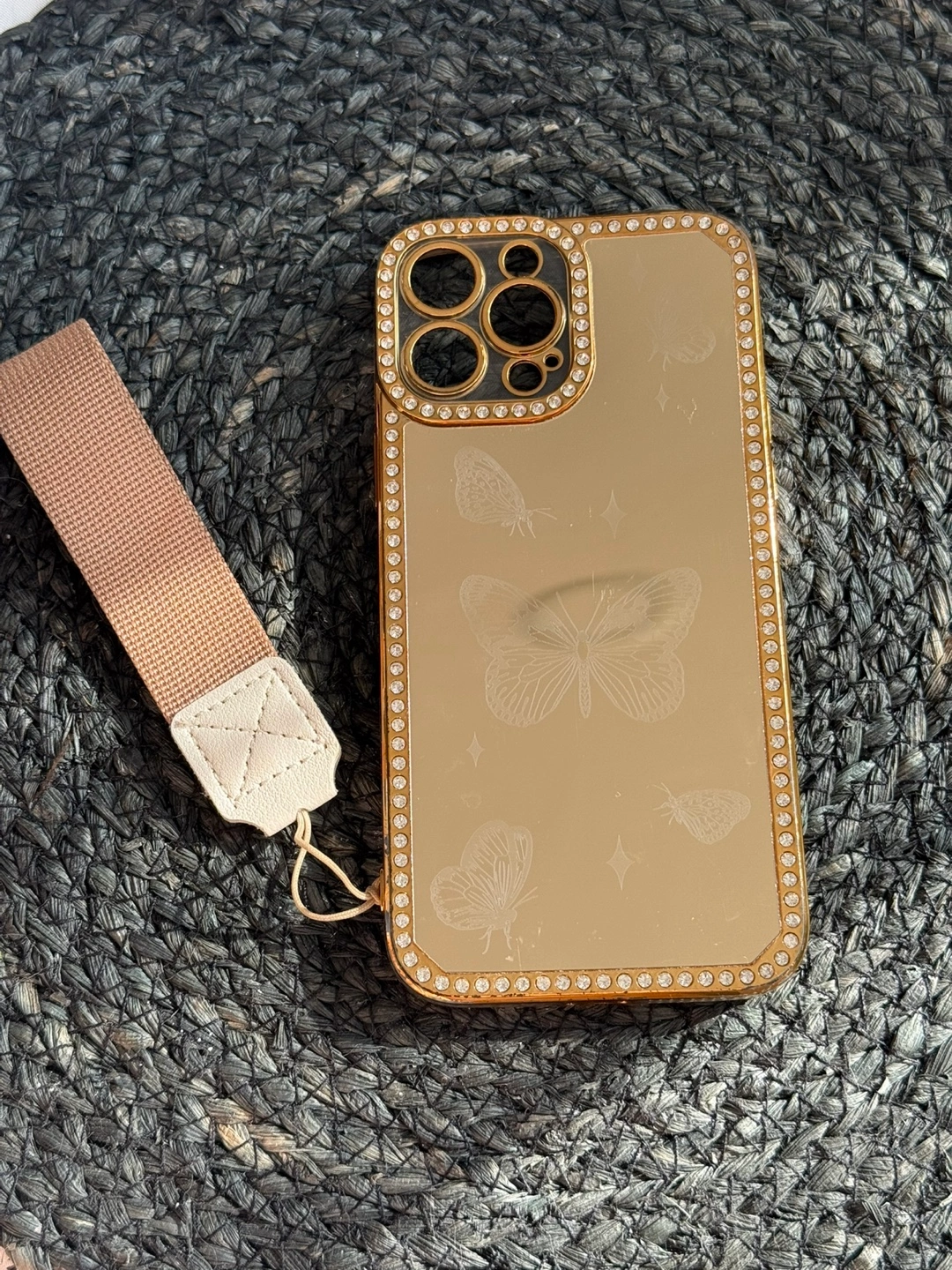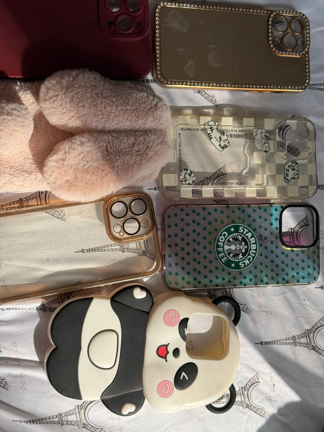 Five unique iPhone 13 Pro Max cases. Panda design, solid red, fluffy bunny, gold butterfly with strap, and Starbucks-themed. Various materials and styles.