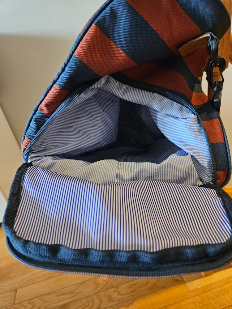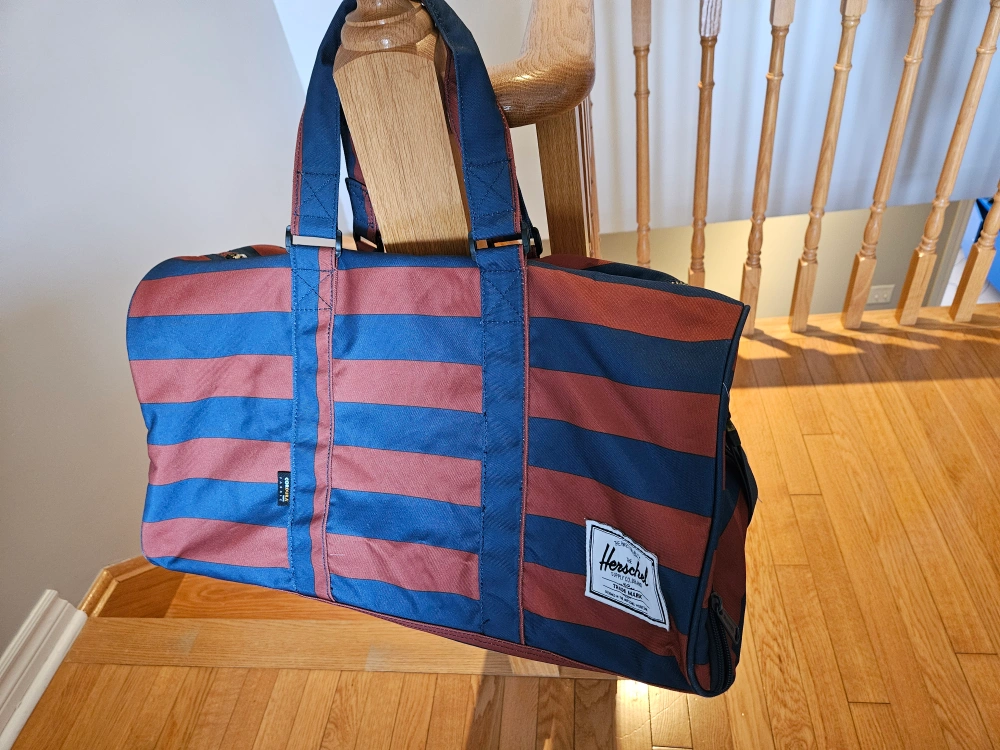 near mint Herschel branded duffel/overnight bag. has a special container on the side/bottom for slippers and sandals.