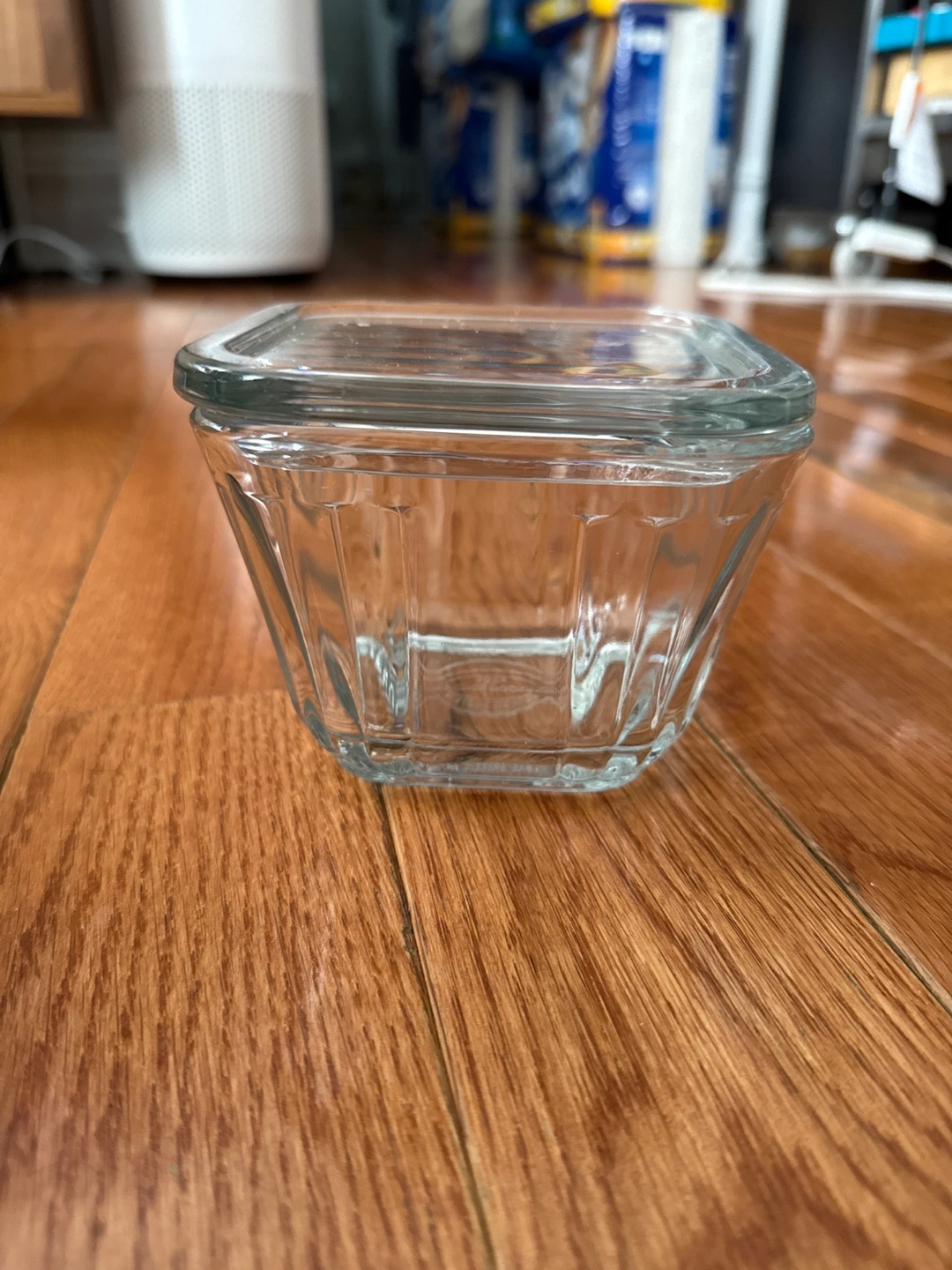 Clear glass container, square shape, ribbed design. Glass lid included. Perfect for storing small items in the refrigerator or during summer months when you’re host
