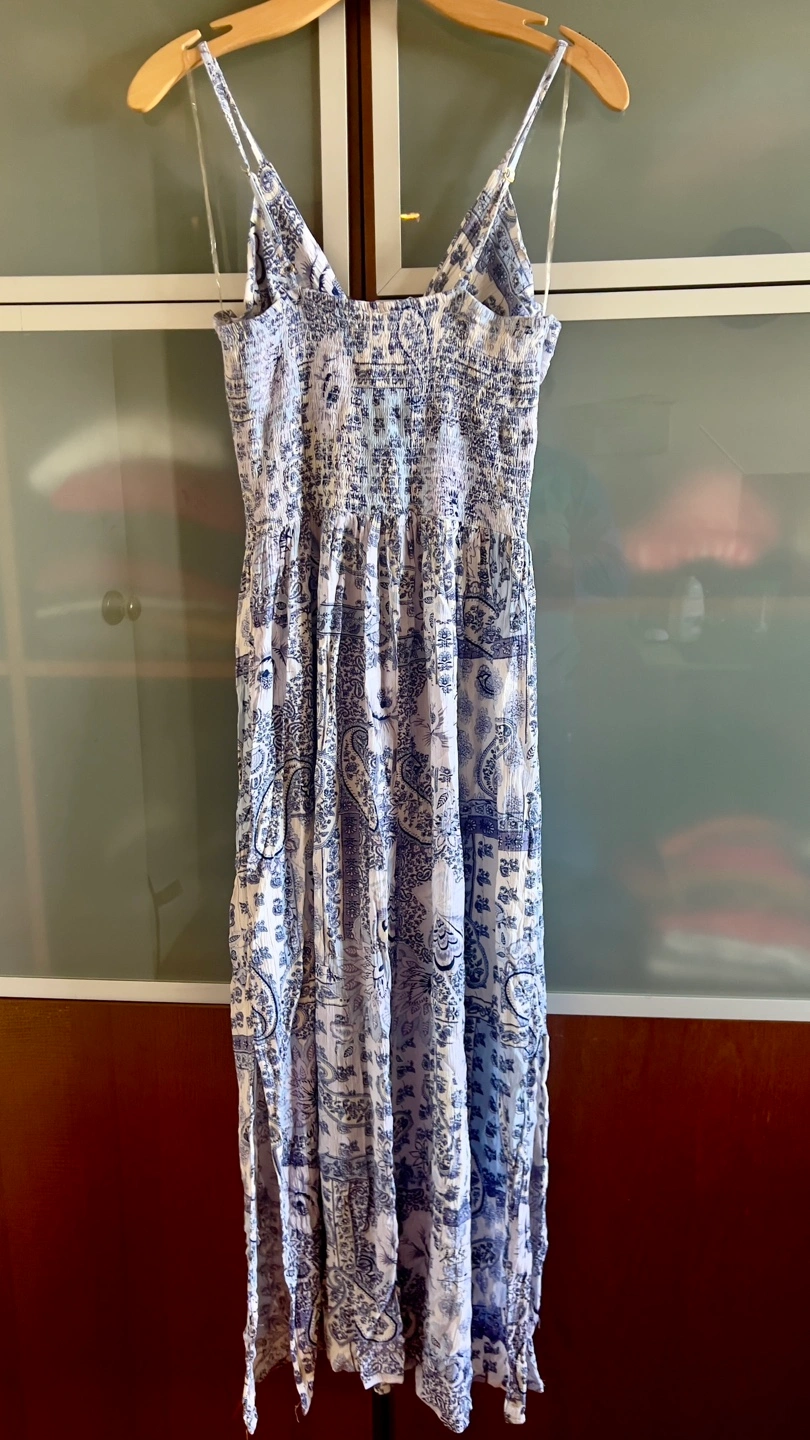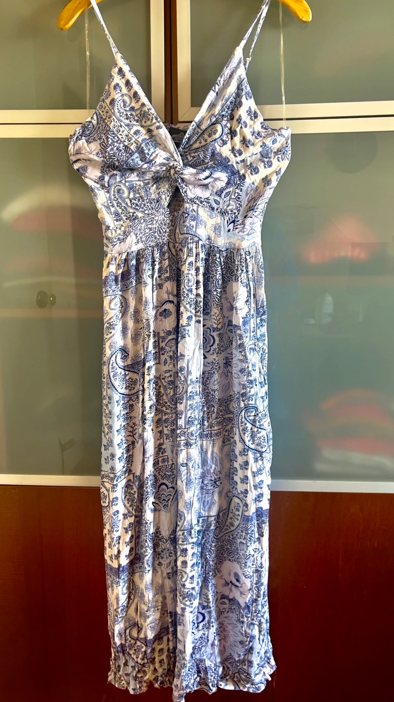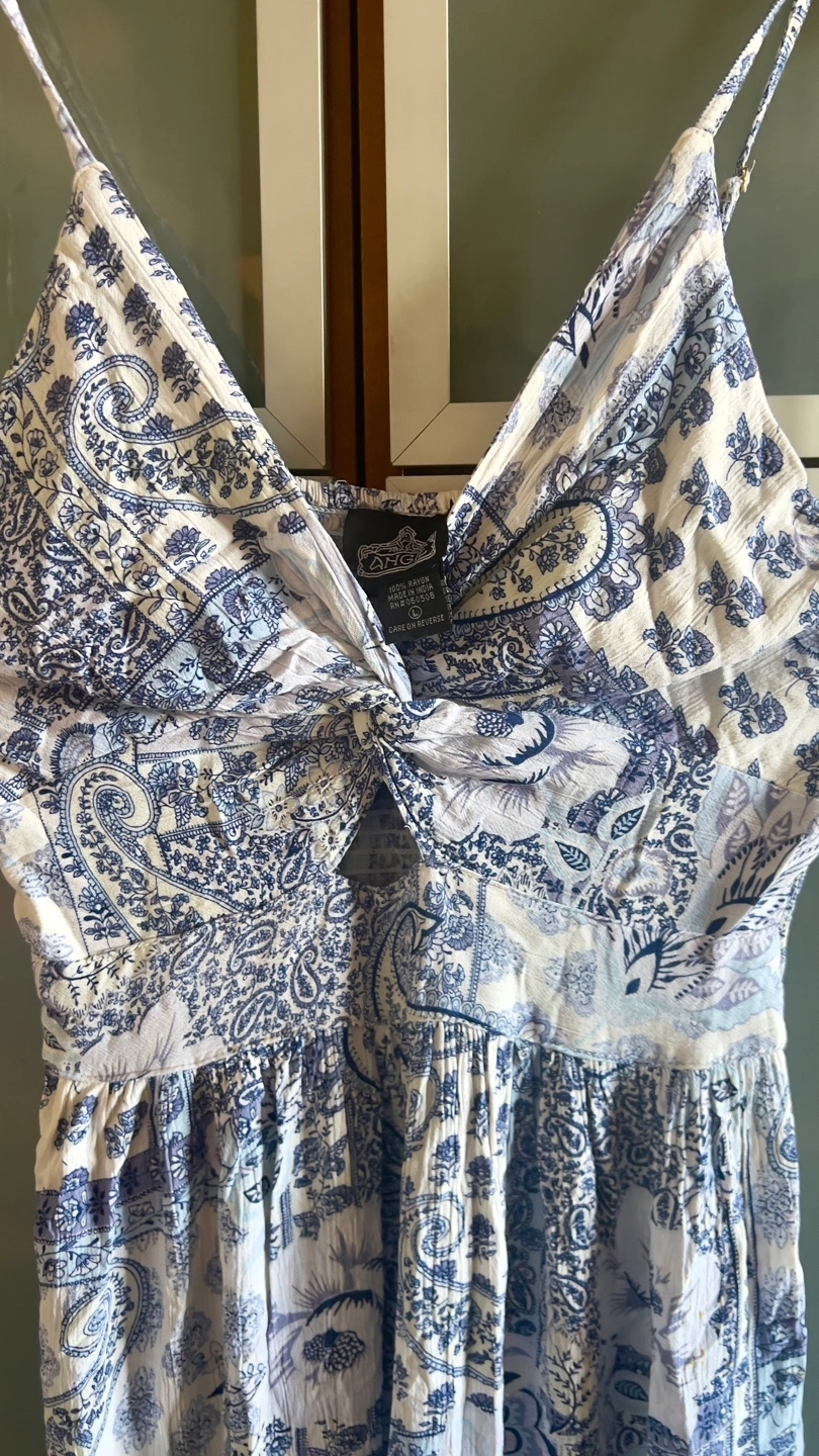430Beautiful blue and white paisley print dress. Features a twisted front detail and adjustable spaghetti straps. Flowy and comfortable. Size: L on label but fits M-L