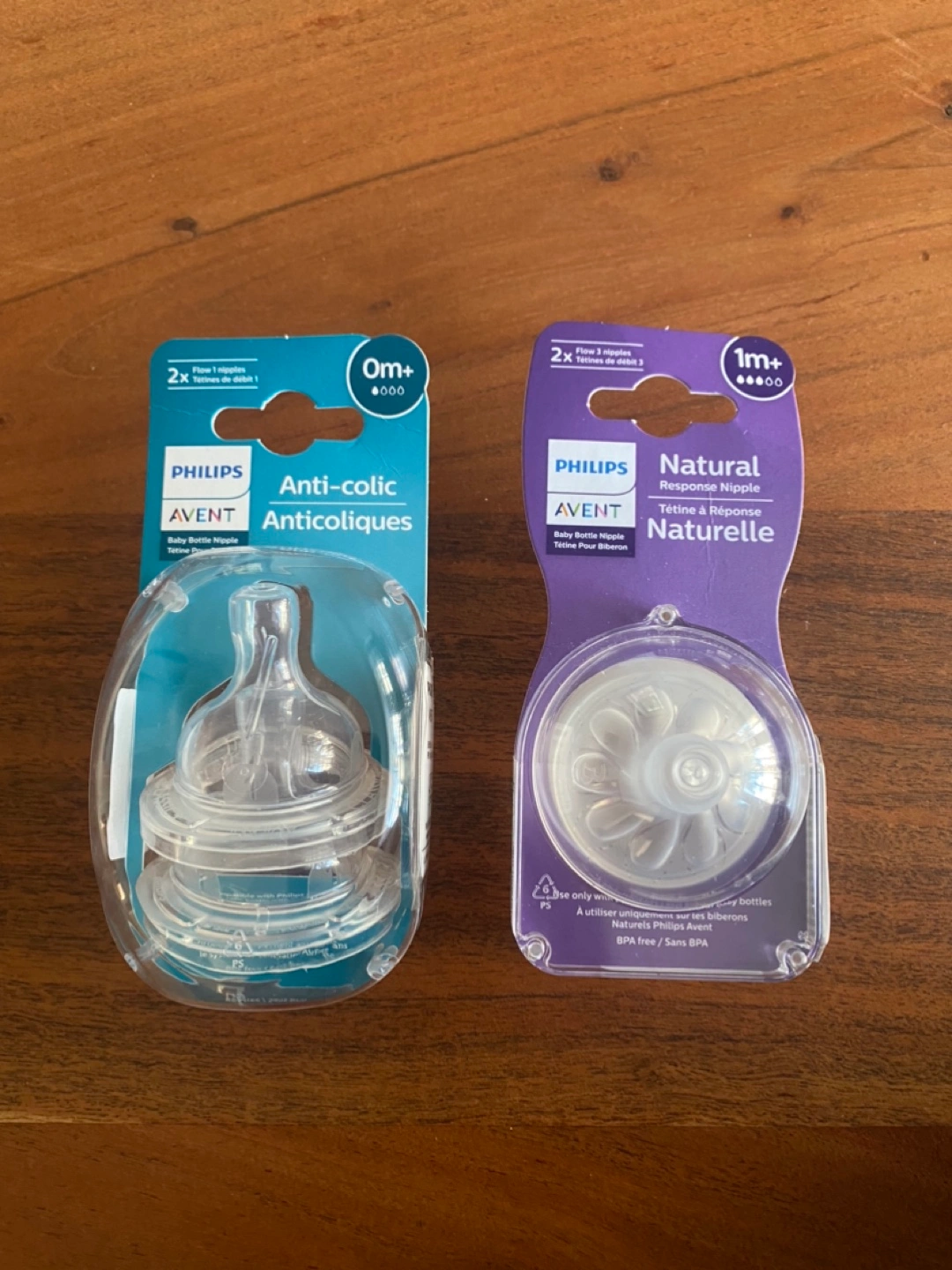 Two packs of Philips Avent baby bottle nipples. One pack contains two size 0+ anti-colic nipples, the other pack has two size 1 natural response nipples. BPA free.