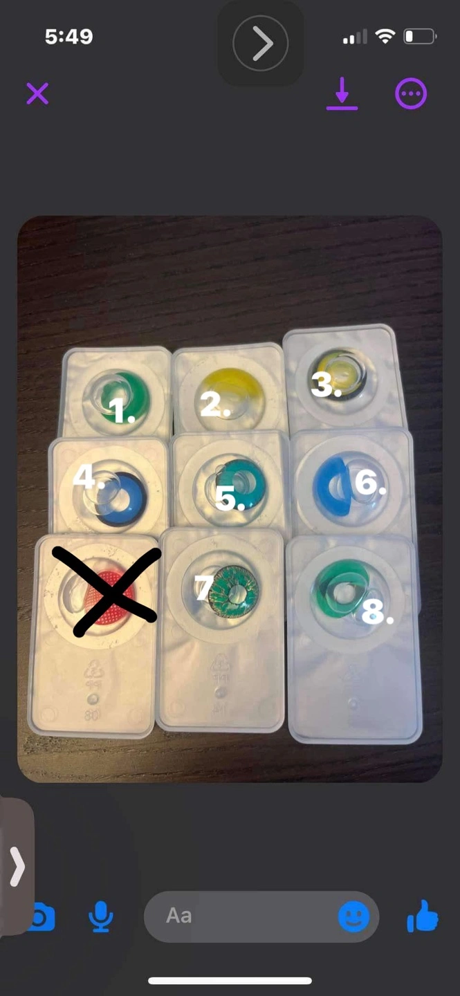 Eight pairs of coloured contact lenses. Various colours available. Unopened packaging. One pair marked with an 'X'.