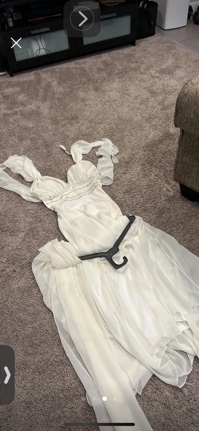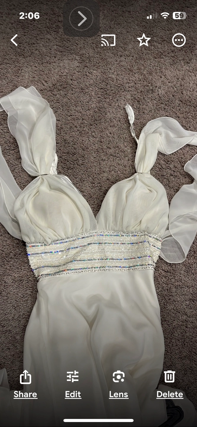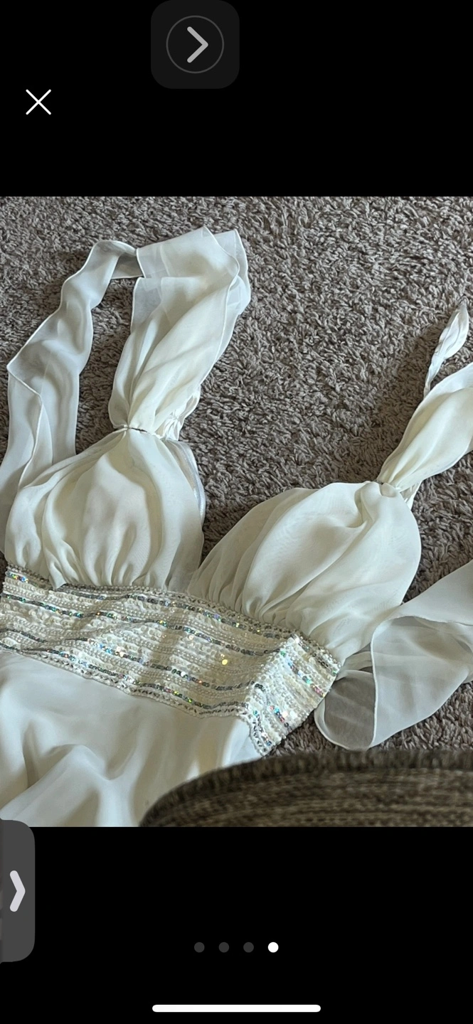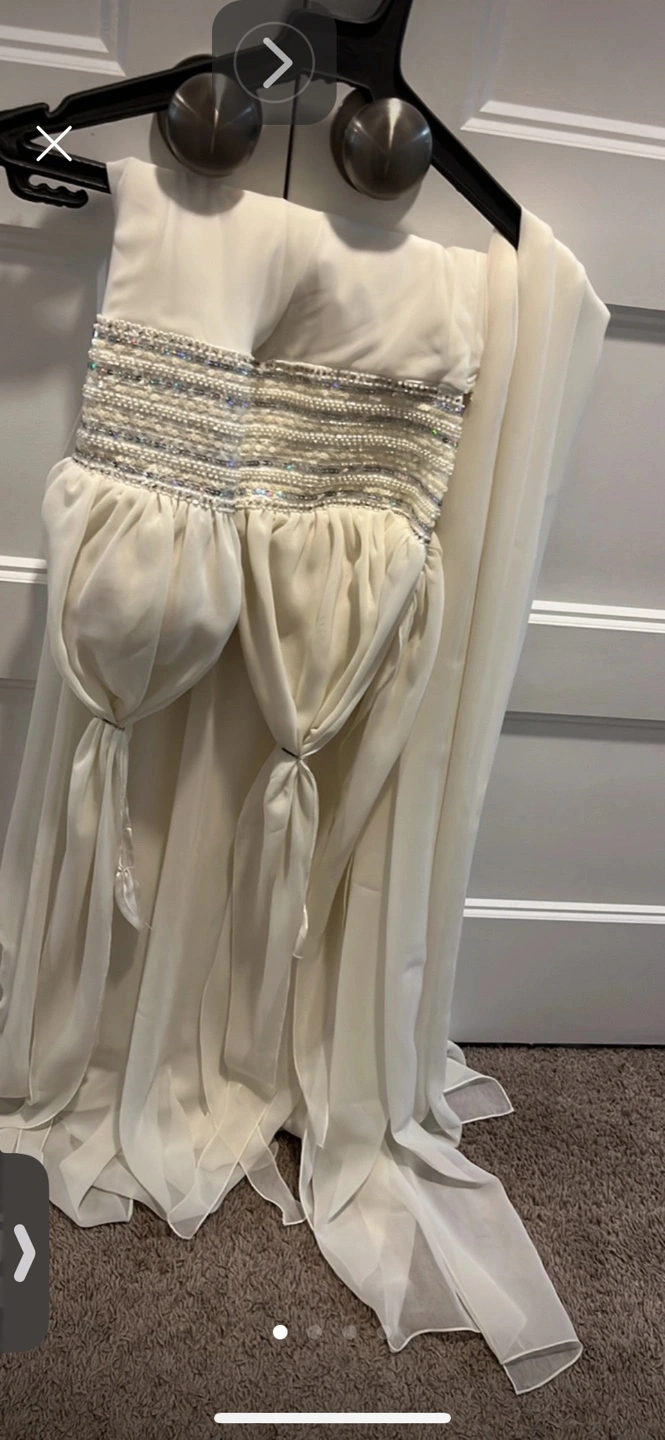 Beautiful off-white floor-length gown. Features a beaded bodice and flowing chiffon skirt. Strapless design with draped shoulder details. Perfect for a special occasion.