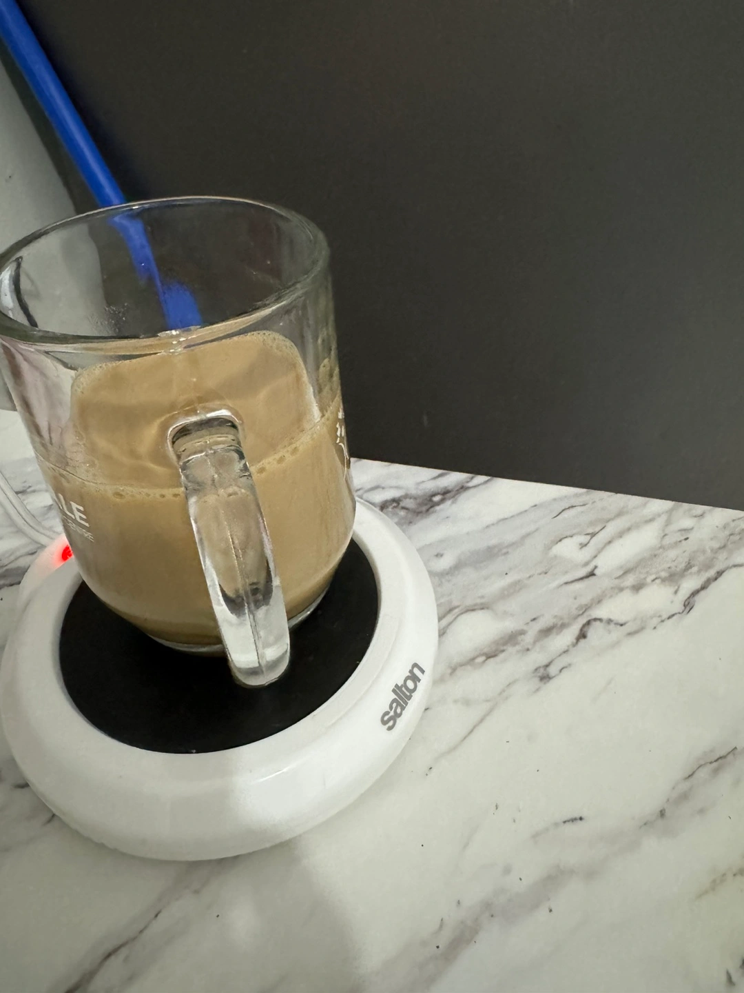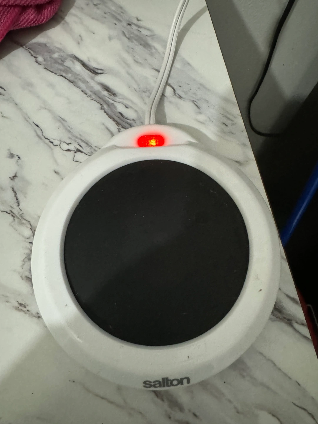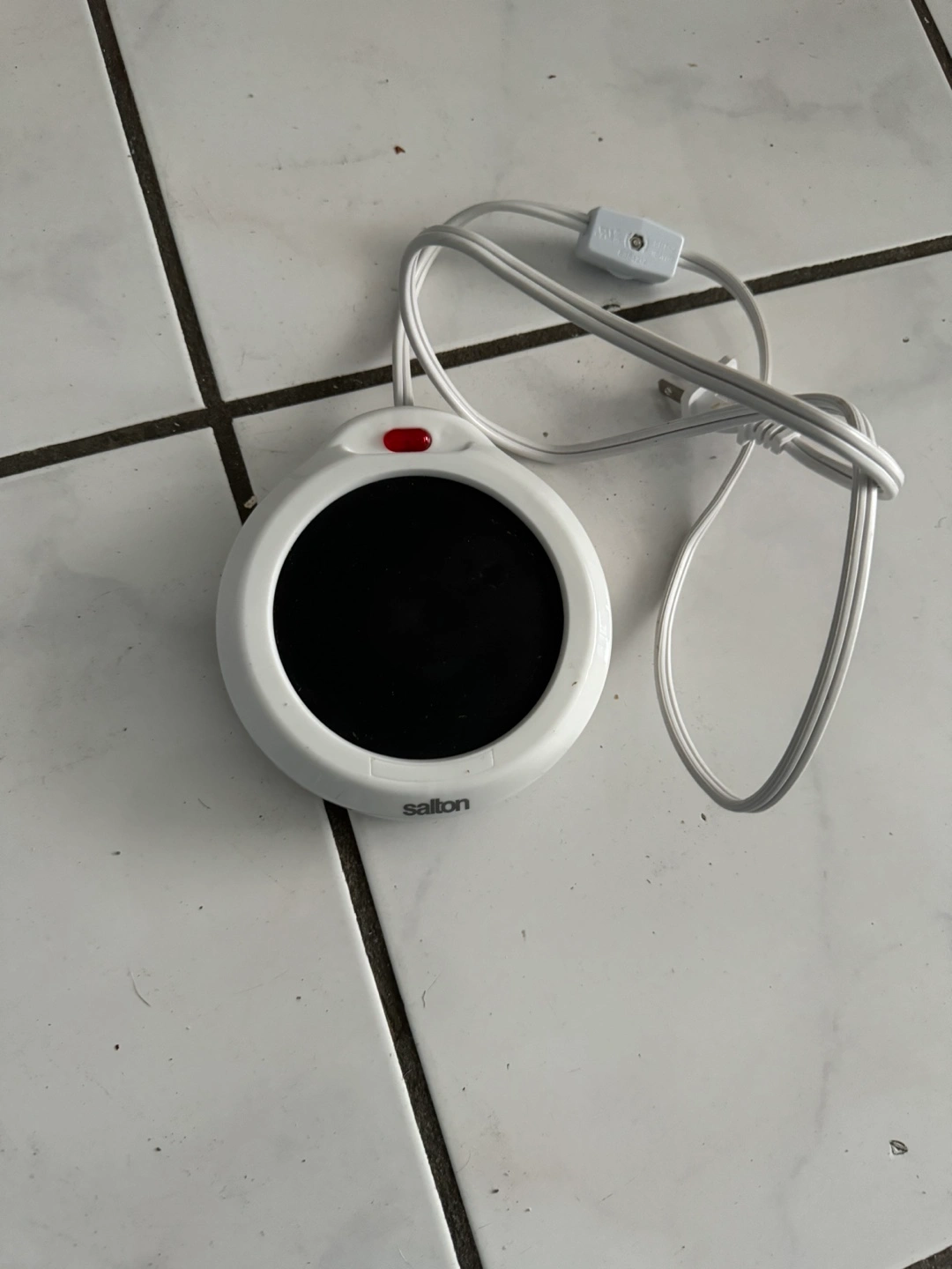 White circular mug warmer. Keeps beverages warm. Features a power indicator light. Includes cord and plug.