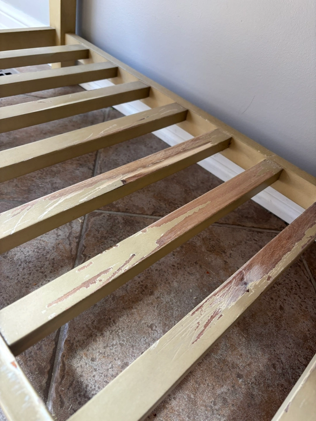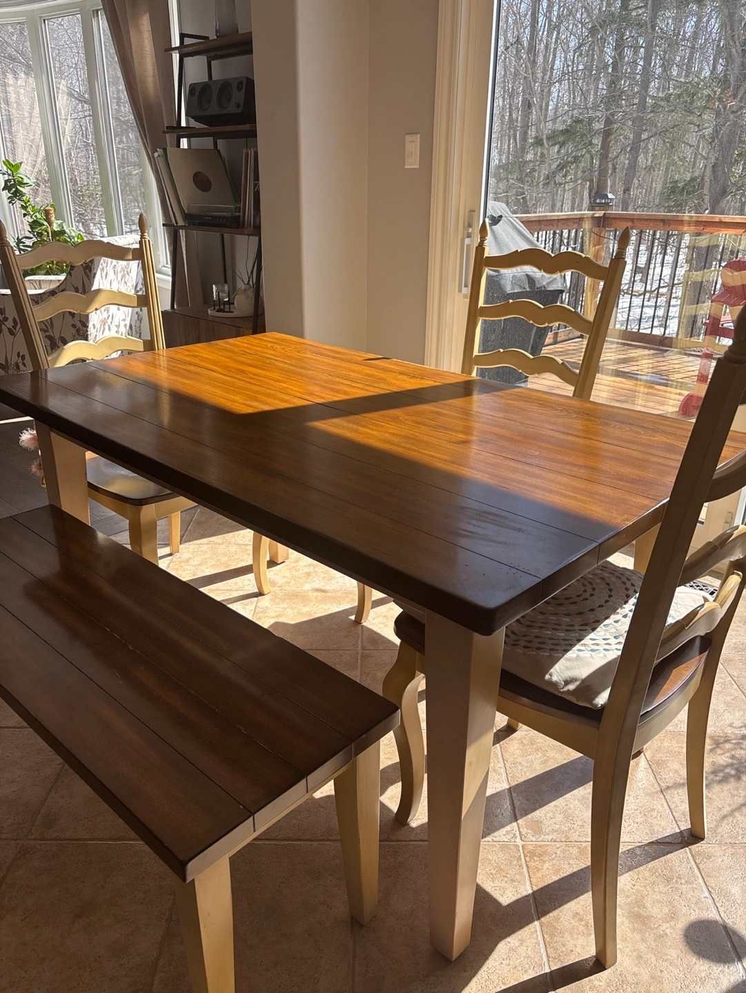 Pier 1 dining set. Includes table, bench, three chairs & sideboard. Warm brown wood top and creamy off-white legs. Sideboard top and bottom needs repainting/ staining, see last 2 pics. Local free delivery or small fee depending on distance.