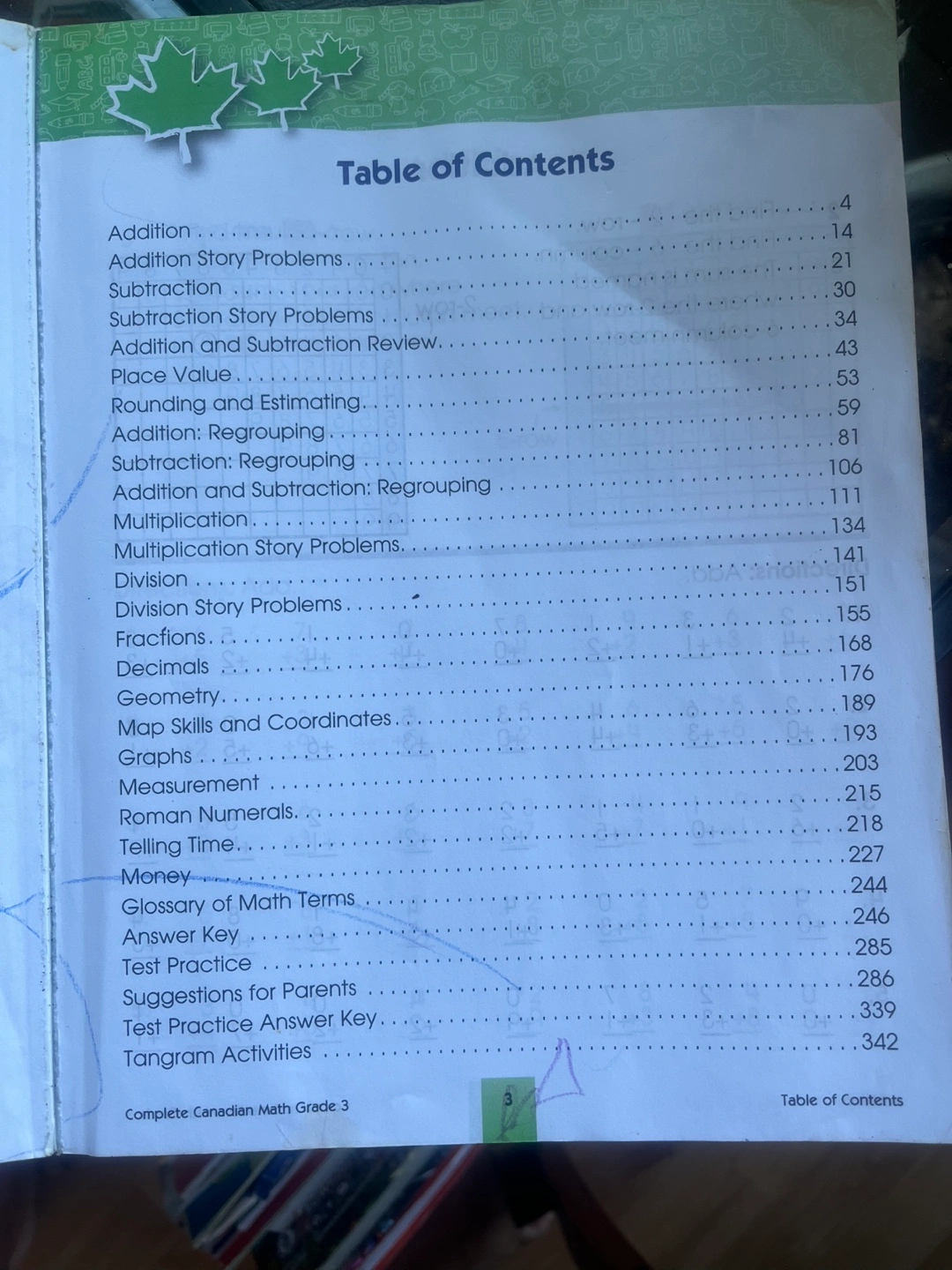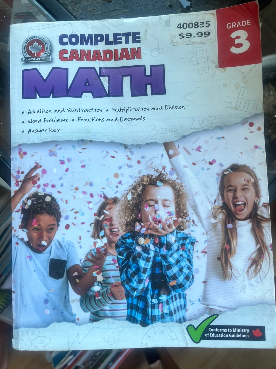 Canadian math textbook. Grade 3. Covers addition, subtraction, multiplication, division, fractions, decimals, geometry, and more. Includes answer key. Good condition. Only 5-10% of the book is used.