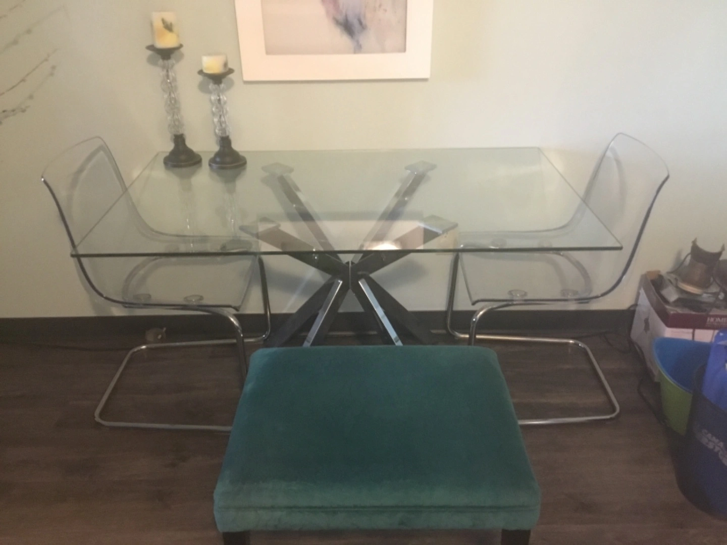 Modern glass dining table set. Includes a glass-top table with a chrome X-shaped base and two clear acrylic chairs. Sleek and contemporary !The green stool does not come with the table and is not for sale. From non smoking home. Cannot deliver. Must pick up near Westbrook mall SW. please bring packing blankets to protect the glass. I will not be responsible for any damage done during the move. The glass is in beautiful condition with only 2 very minor scratches that arnt visible as you can see on the photos. E-transfer is acceptable and cash. Price is negotiable