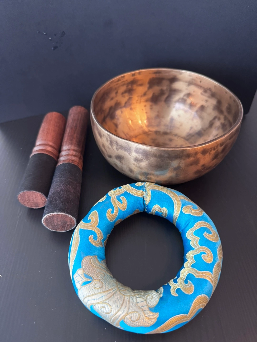 Beautiful singing bowl, two wooden mallets, and a cushion.